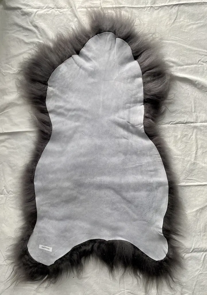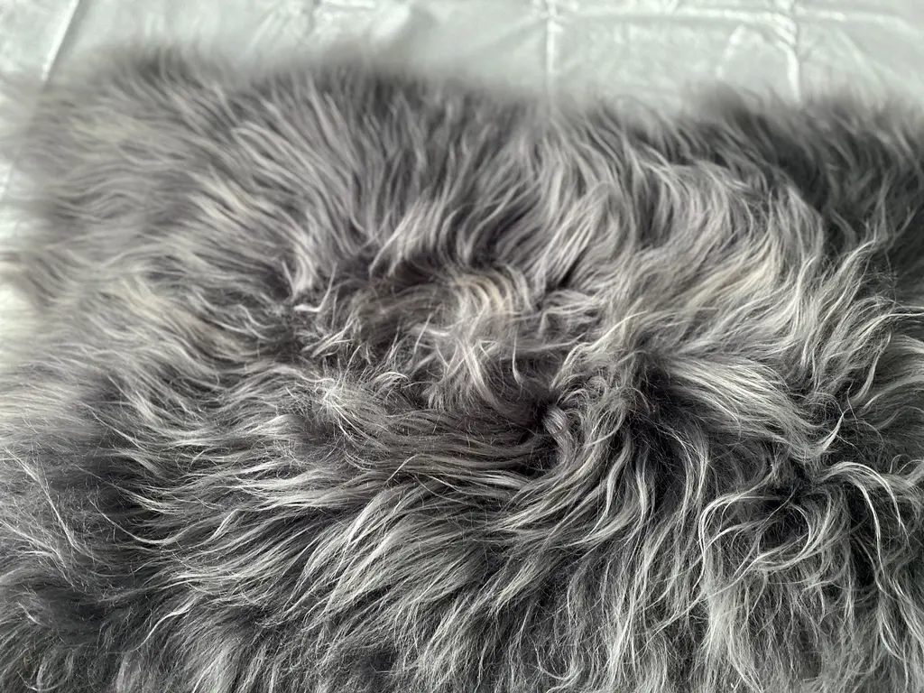 Luscious gray Icelandic sheepskin has silky strands of hair from 6" to 7". These are different from the normal sheepskin hides because of their dense and long hair. Professionally tanned, this is suitable for use as a throw over a sofa, bench or chair, or on the floor. Dimensions: 24" x 43". Each is one of a kind. This is an unused item.