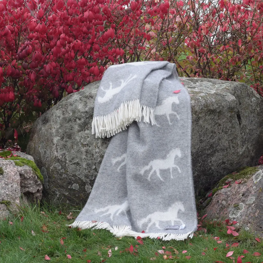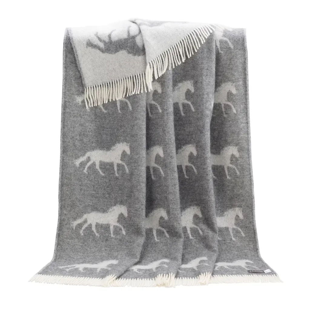 Sit back and dream of galloping in the fields with the prancing horses on this beautifully soft 100% pure wool throw in a reversible grey and off-white colour scheme. This throw will become an instant heirloom and will complement any décor and is also machine washable.Happy living with friendly designs!