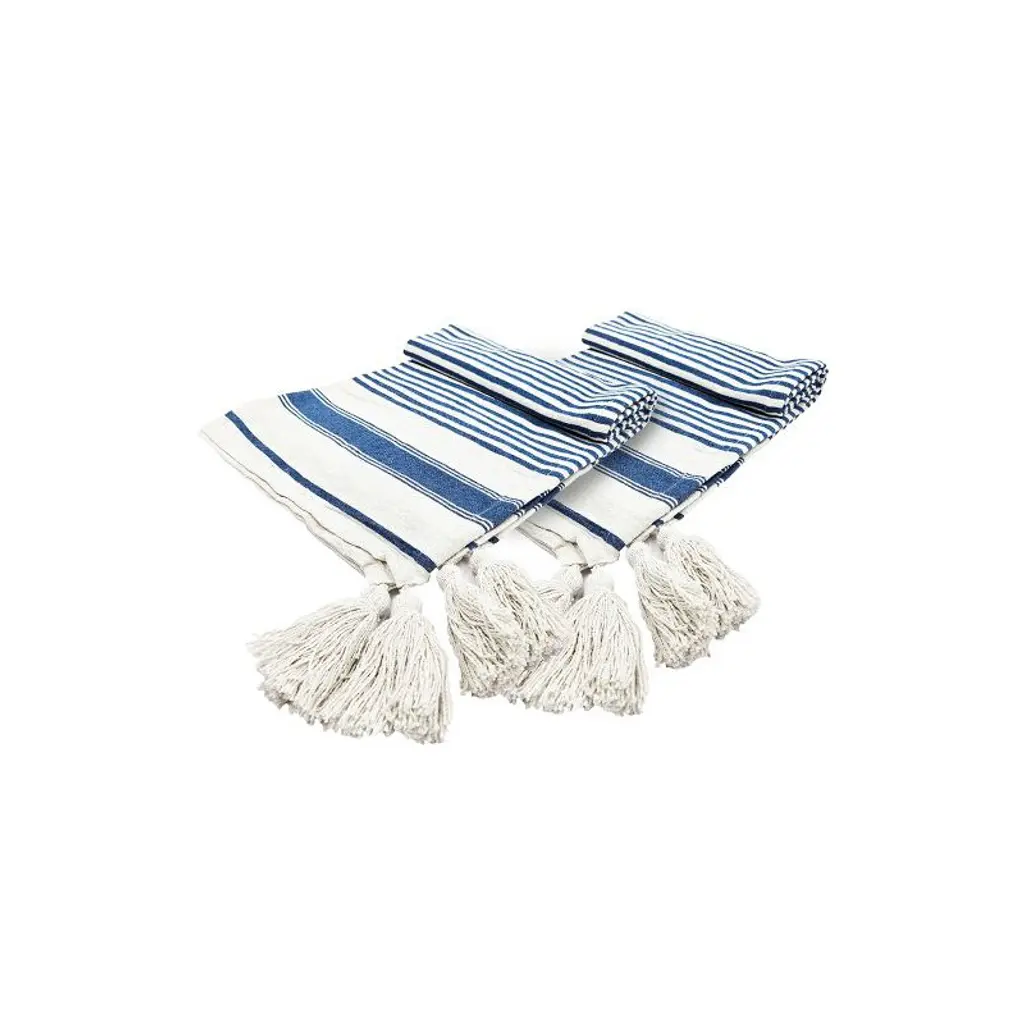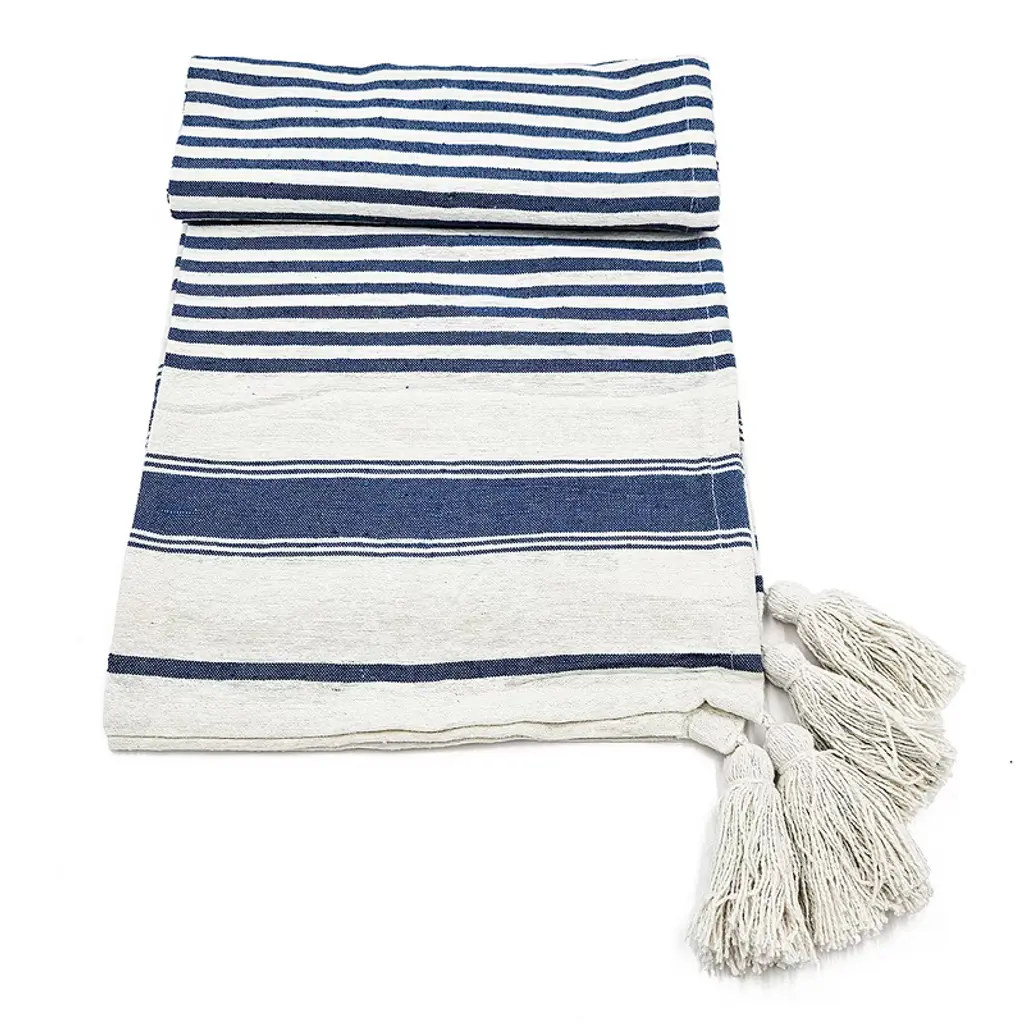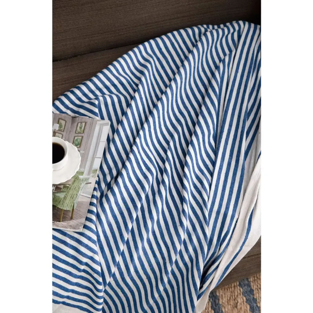 Gulches 50x60 inch Brighton Blue Striped Throw Blanket 2 Pack features thin blue and white stripes leading down to a large block stripe at the bottom Crafted from 80% recycled cotton and 20% polyester it is more than just a cold protection piece it can serve as an accent on sofas beds or any space Thanks to the neutral colors it easily slots into any style and decor The neutral muted tones allow it to blend seamlessly into almost all styles and interiors from chic and boho spaces to traditional and farmhouse themed rooms Each blanket measures 60x50x0.2 inches and weighs 1.3lbs