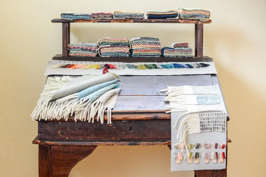 The Otilia Hand finished organic wool wave design pattern blanket/throw has been created by an incredible and unique family owned weaving and textile company in Portugal. This company impressed us so much by their commitment to working with the environment, their dedication to their community and their heart centred manufacturing process. The family have been in the wool business for generations from 1980. They then took a big leap into helping to resurrect a dying industry that was due to be lost forever. Restoring local unused machinery and buying antique looms and equipment they took over a long abandoned factory that had hystorically made carpets. They set about reviving a dying industry and preserving local skills that Portugal had once been admired and respected for. The Story starts with an inherited family knowledge in the ethical wool industry. The wool process includes naturally picking, scouring, combing, spinning and dyeing and then weaving on antique looms. The woollen blankets are all a blend of Marino and other varieties of local wool. All the products are carefully finished by hand for a beautiful detailed and high quality product. The patterns are consciously chosen using sacred geometric designs, reimagined and updated traditional designs with beautiful colors chosen to lift the soul and elevate ones mood. Colors are carefully mixed using natural dyes inspired by nature from the local countryside in the heart of Portugal. The wool is carefully handled, washed and naturally treated to give a luxurious soft finish, giving you a guarantee of luxury, quality and resilience. The power of the diamond shape in sacred geometry depicts the value in immaculate beauty. Its physical appearance is associated with living a meaningful life with purity, clarity and wisdom. Each piece is carefully finished by hand using local craftsmen bringing their dedication to beauty into every piece.At this unusual time in history, we are in need of all the comforts when we are home. Warmth and comfort are synonymous and a necessity rather than a luxury. Color lifts our mood and wellbeing when carefully placed around us. With these blankets and throws we bring you comfort and luxury, warmth and nurturing. The blankets have a multi-use function doubling as beautiful and stylish blankets for any bed to add extra warmth for the winter or summer. They are also fabulous as a throw, as they are soft and luxurious and useful to cuddle up with on any sofa or lounge chair, bringing an unrivalled coziness, indoors or outdoors. Perfect for adults or children to enjoy!Moving forward in this ever changing business landscape, we are committed to supporting local artisans that are helping to revive local communities and keep skilled people employed. This business is integrity driven to support the environment and its community whilst also committed to healthy farming practices and the loving care for the animals. The machinery used was built to last from the 1960s and is carefully maintained by local skilled technicians. Certified dyes that support our health and environment are always used. Every step of the sourcing and manufacturing process reveals the exquisite end result with every piece made. We hope you enjoy these products as much as we do and that you will feel good inside and out whilst wrapping yourself in their comfort. Enjoy!