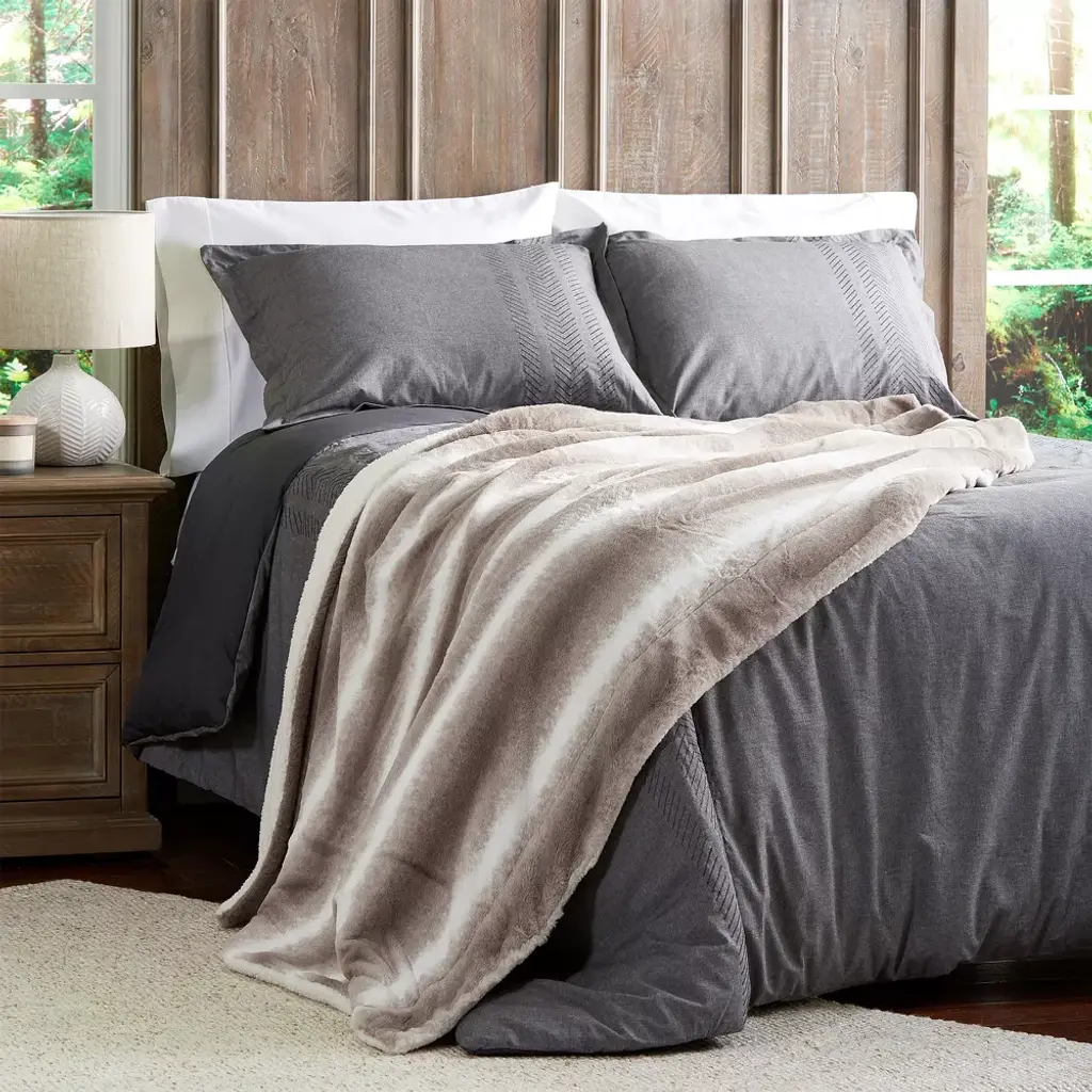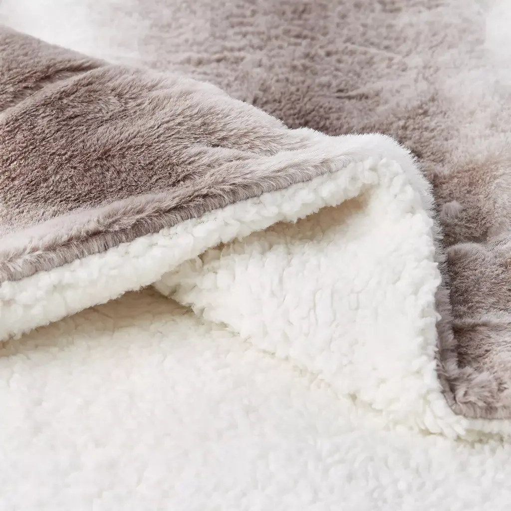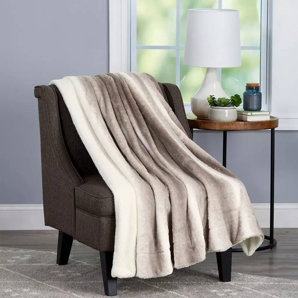 Create an inviting look in any room or reading nook with this Faux Rabbit Fur and Faux Shearling Throw Blanket by Hastings Home. Featuring a simple yet elegant design in neutral cream beige and cream tones, this soft blanket boasts a reversible design that lets you change up the look of your sofa, bed, or chair and comes cross-wrapped with a black satin ribbon that makes it suitable for gifting at weddings, showers, holidays, and housewarmings. Construction with a plush faux rabbit fur front and Faux Shearling back helps this hypoallergenic throw blanket lend texture to your bedroom decor aesthetic while providing all-season warmth for year-round use.