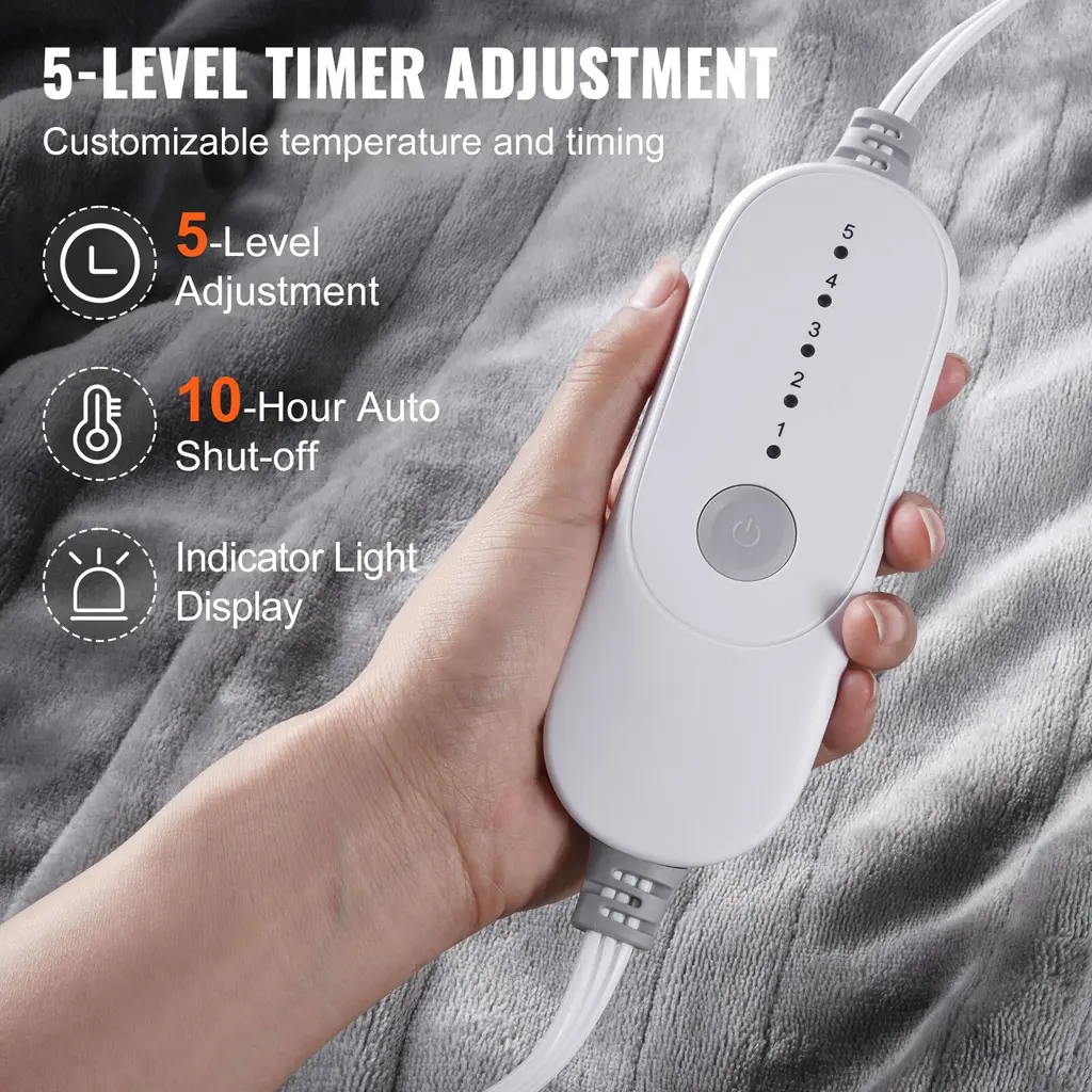 Even Heating From Every Angle: Dive into the warmth that's spread consistently throughout! Our heated blanket features uniformly distributed heating wires. This unique design speeds up to that cozy temperature, ensuring every spot is as toasty as the next. Softer Than a Cloud: The electric blanket is crafted from soft and comfortable material. Imagine being wrapped in a gentle hug on those frosty days. That's our blanket for you, a delightful mix of comfort and warmth Your Warmth, Your Way: This heating blanket is equipped with two easy-to-use controllers. From a light toast to super snug, choose from our 5 quick heating settings catering to various needs. Tailor-made warmth for every cold day and every mood! Security First, Always: Sleep easy, knowing we've got your back. With ETL and FCC nods, our heated throw blanket boasts top-notch security features to keep things just right. It has built-in overheat protection and over-voltage protection systems. No overheats or nasty surprises here! From Bed to Desk: Whether you're curling up for a movie night or need that extra warmth during a long workday, this heat blanket's got you covered. Plus, its multi-functional design and comforting warmth make it a heartwarming gift for just about anyone. Package Content 1 x Electric Heated Blanket 1 x User Manual