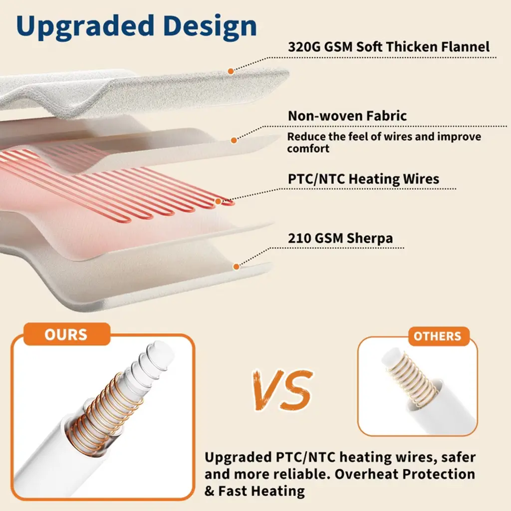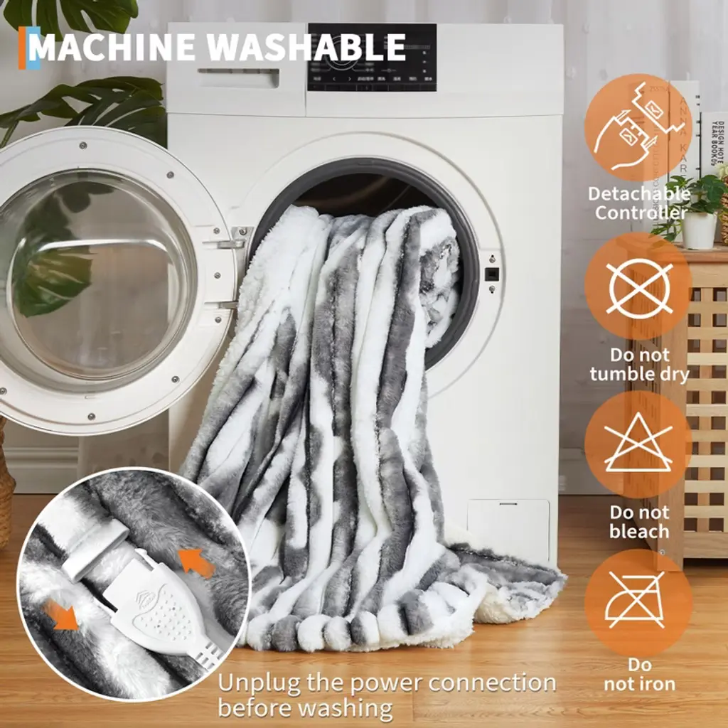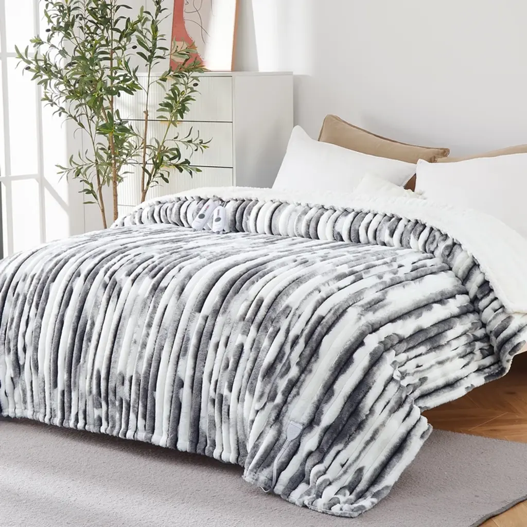 Highlights at a Glance:-Safe, fast, and even heating for dependable warmth all winter-Available in multiple sizes to suit any space or occasion-Adjustable heat settings with automatic shut-off for peace of mind-Luxuriously soft striped faux rabbit fur fabric-Extra-long power cord for flexible and convenient use-Easy care for lasting comfort and warmthSpecification:Material: 100% PolyesterColor: Grey/WhiteSize: Throw Size/Queen Size/King SizeApplication: Bedroom/Living Room/Office/SofaPacking List:1 x Electric Blanket1 x Instruction ManualNotes:1. Proper Storage: Store flat or rolled, never folded tightly, to avoid damaging heating elements.2. Keep Dry: Never use the electric blanket when wet or expose it to water to avoid electric shock.3. Turn Off When Not in Use: Always switch off the blanket before going to bed or leaving the house.