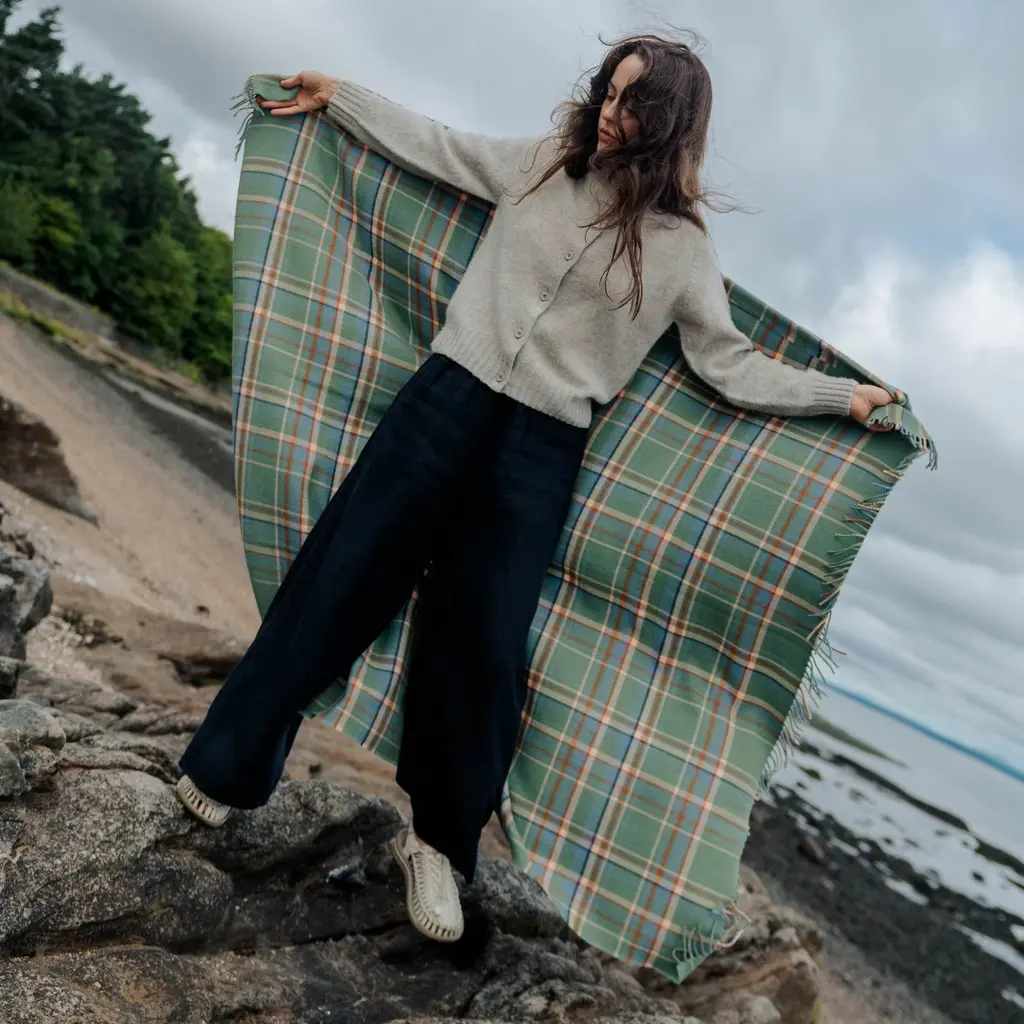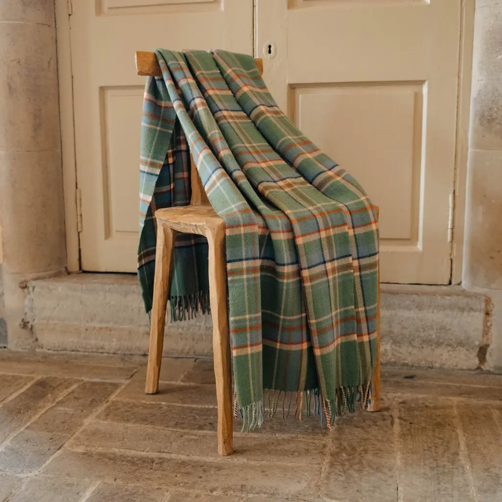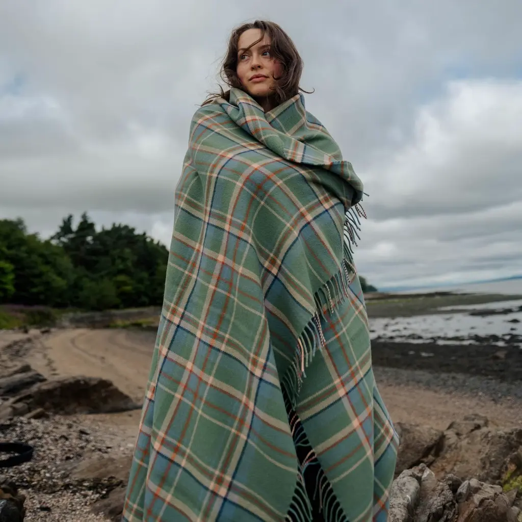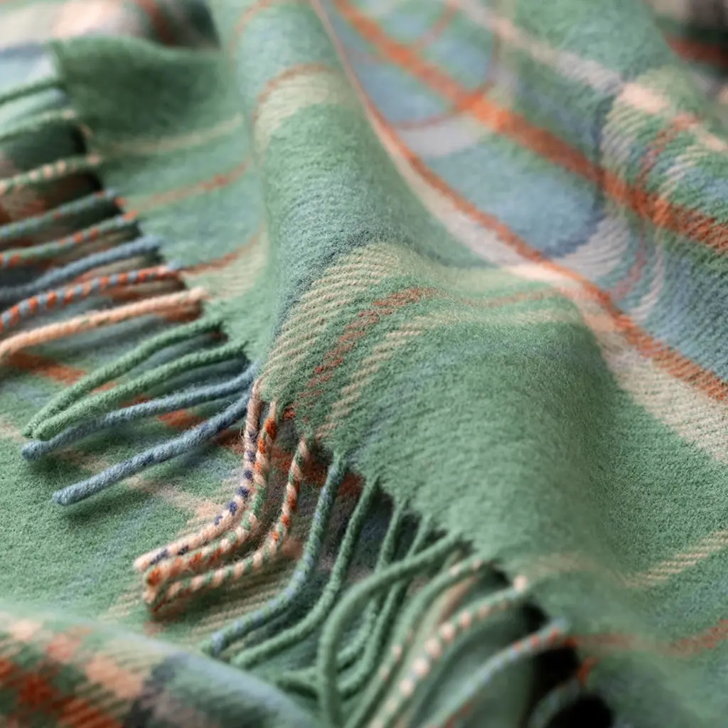 100% Lambswool – luxuriously soft, naturally warm and comfortable, inspired by The Scottish Highlands – as the sun rises over the mountains. Designed in Scotland by renowned textile designer, Araminta Campbell. Made in Scotland, woven in a family run 200 year old Scottish mill.Limited Edition, exclusive, collectible piece, made in small batches. Unique Araminta Campbell Palette of leaf green, light blue, peach, orange and navy.Generous Size of 140 × 180cm ideal for draping over beds, sofas or armchairs, adding warmth and timeless Scottish elegance to any space.Comes with a Branded Cloth Bag to keep your throw safe and is perfect for gifting.