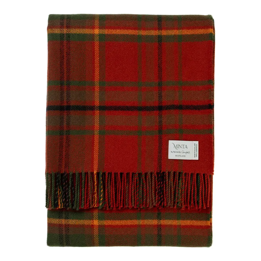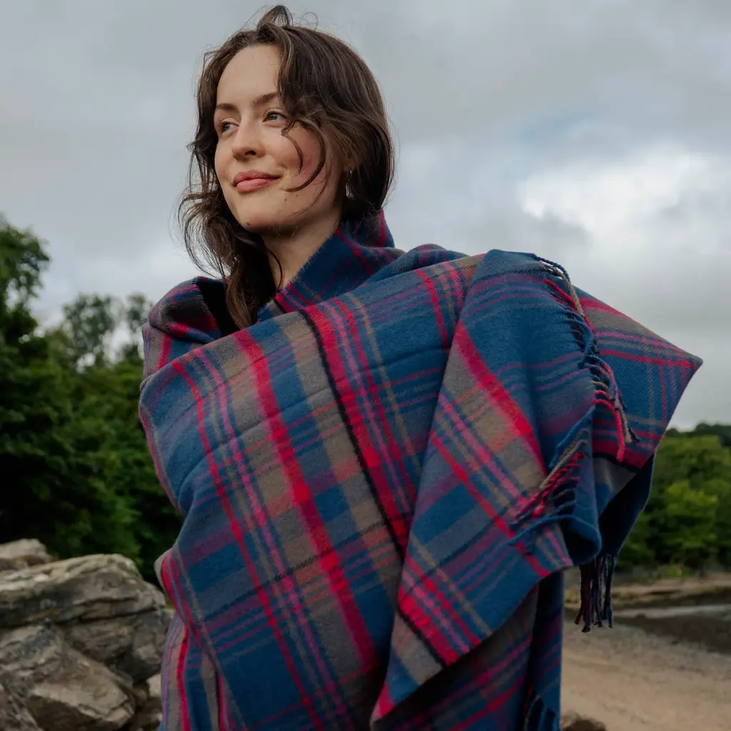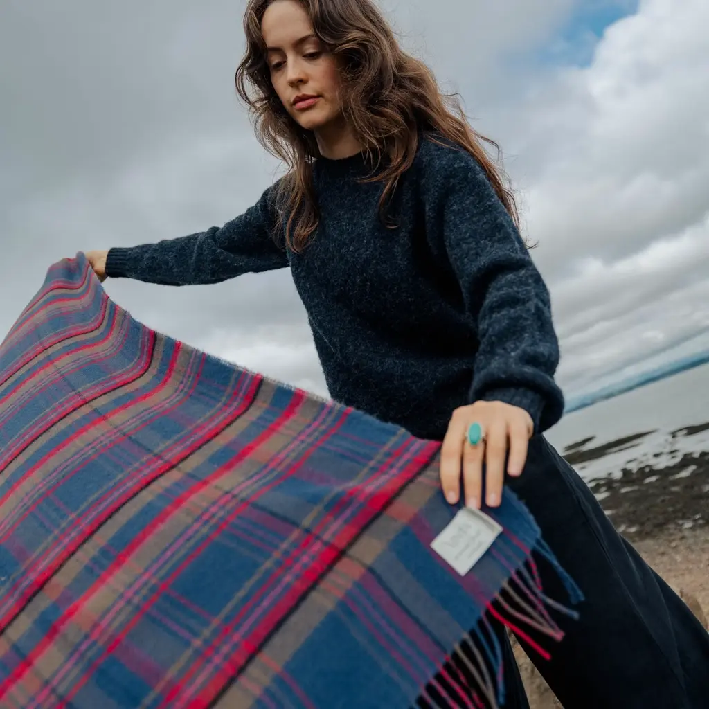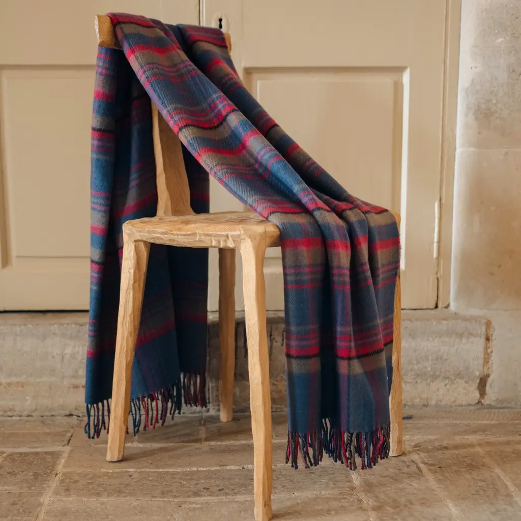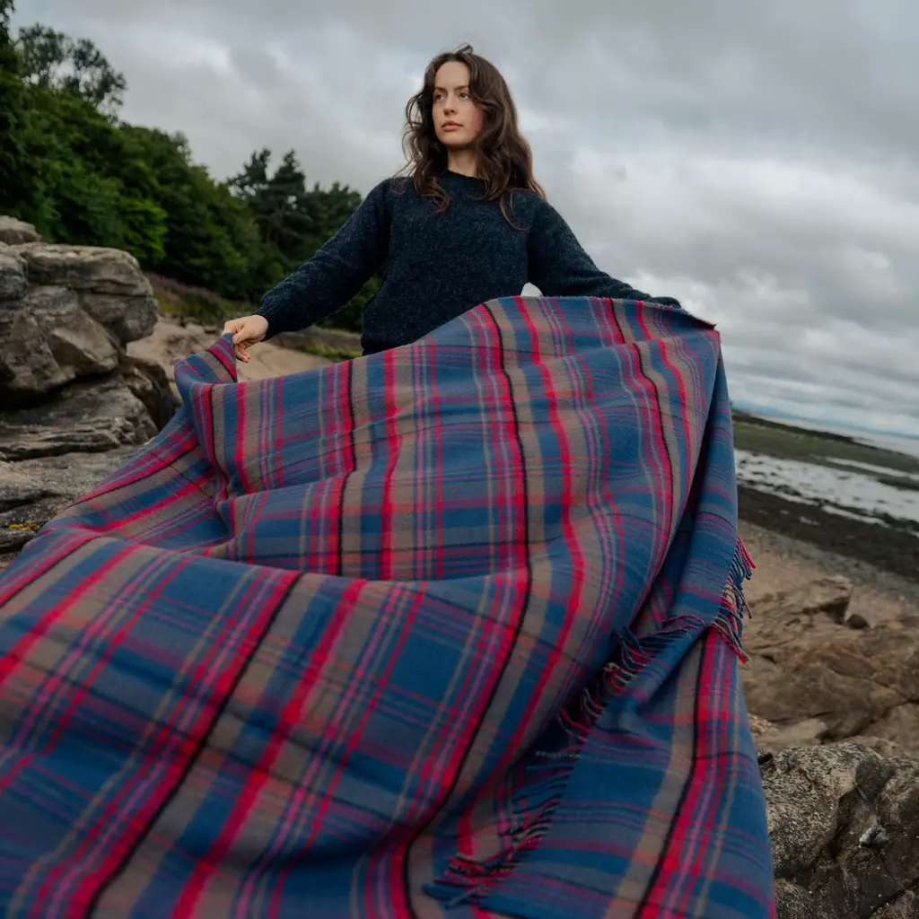 100% Lambswool – luxuriously soft, naturally warm and comfortable, inspired by The Scottish Highlands as the sun sets over the mountains. Designed in Scotland by renowned textile designer, Araminta Campbell. Made in Scotland, woven in a family run 200 year old Scottish mill.Limited Edition, exclusive, collectible piece, made in small batches. Unique Araminta Campbell Palette of dark blue, brown, red, pink and black.Generous Size of 140 × 180cm ideal for draping over beds, sofas or armchairs, adding warmth and timeless Scottish elegance to any space.Comes with a Branded Cloth Bag to keep your throw safe and is perfect for gifting.