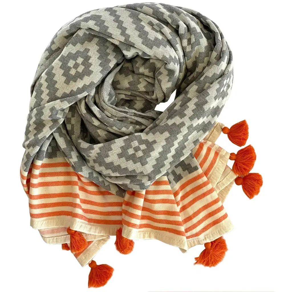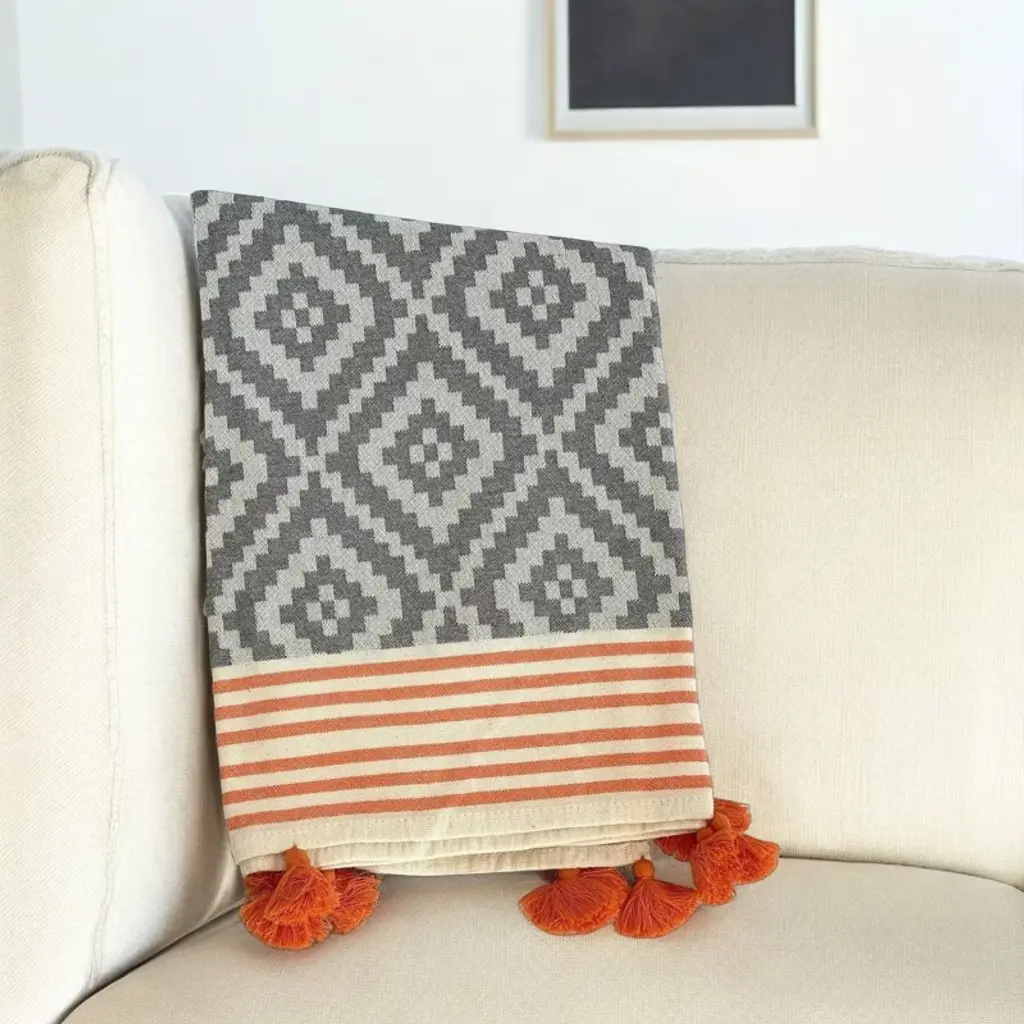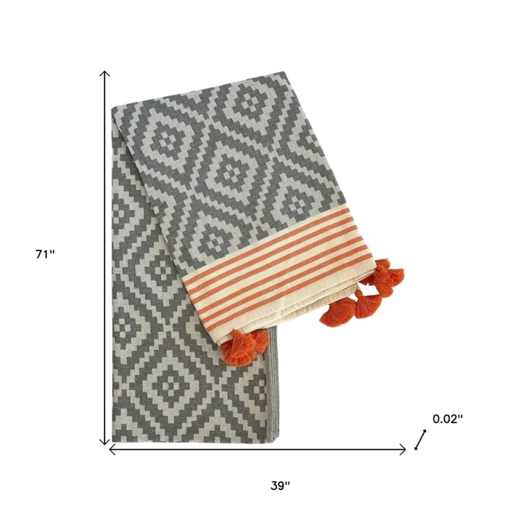 Homeroots 39" X 71" Gray And Orange Cotton Geometric Turkish Towel Throw Blanket With Tassels
