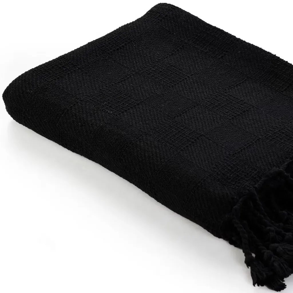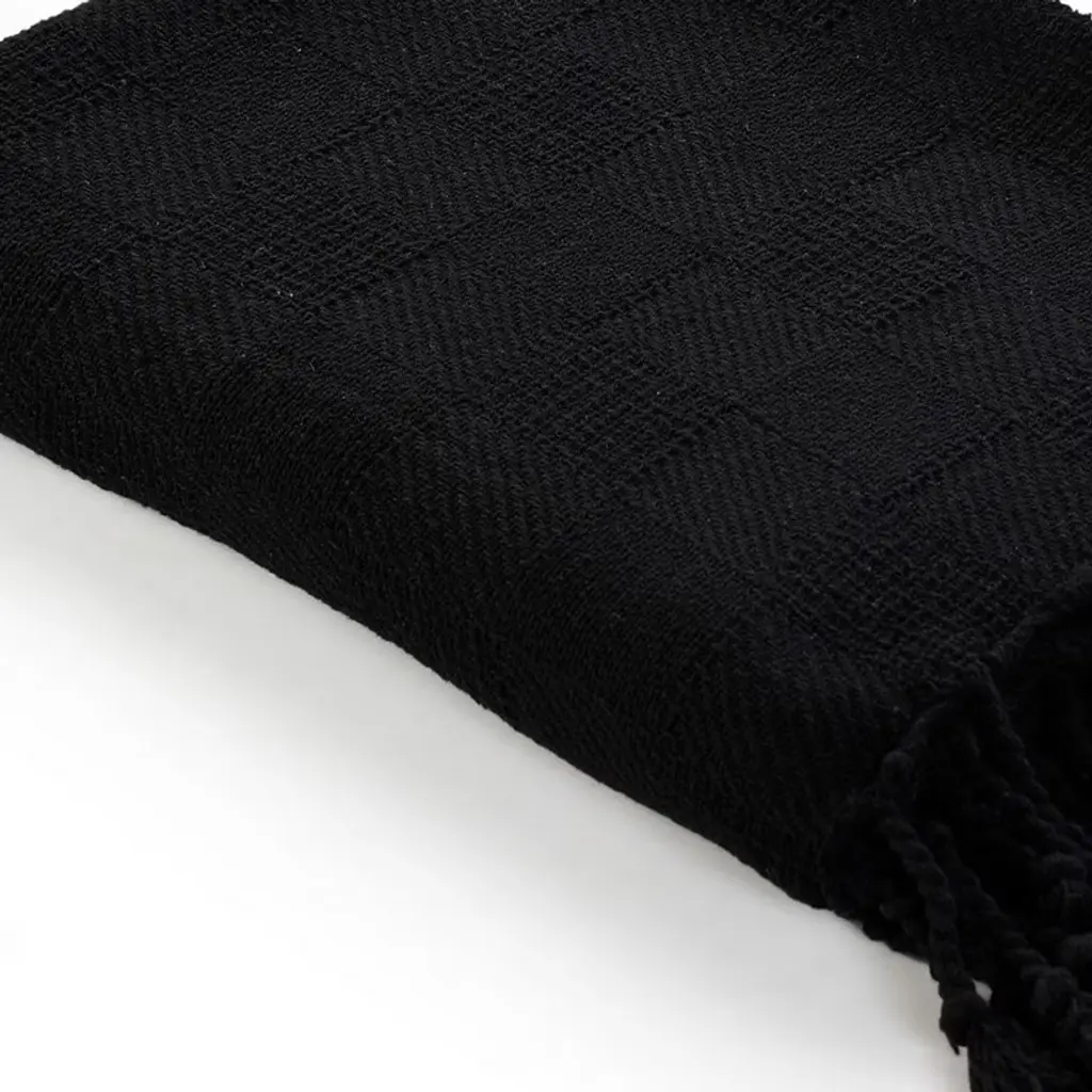 This welcoming black woven cotton solid color throw blanket is a must-have for every sofa, chaise, and bed. Features a textural hand-woven tone-on-tone square design that offers sumptuous softness and texture that you'll cherish for years to come. Made from 100% organic cotton this blanket will make a great addition to any room it's added to. This cozy throw blanket makes the perfect add-on to movie nights and lazy afternoons. 50-inch H x 60-inch W x 0.2-inch D