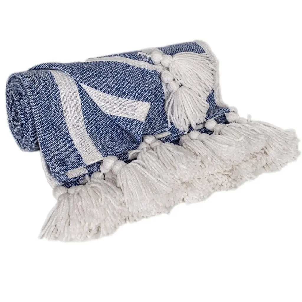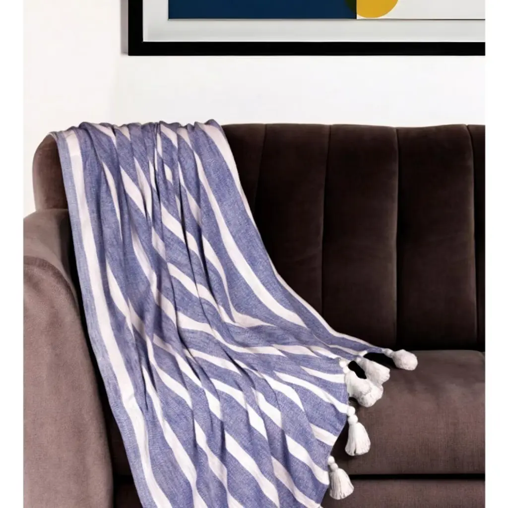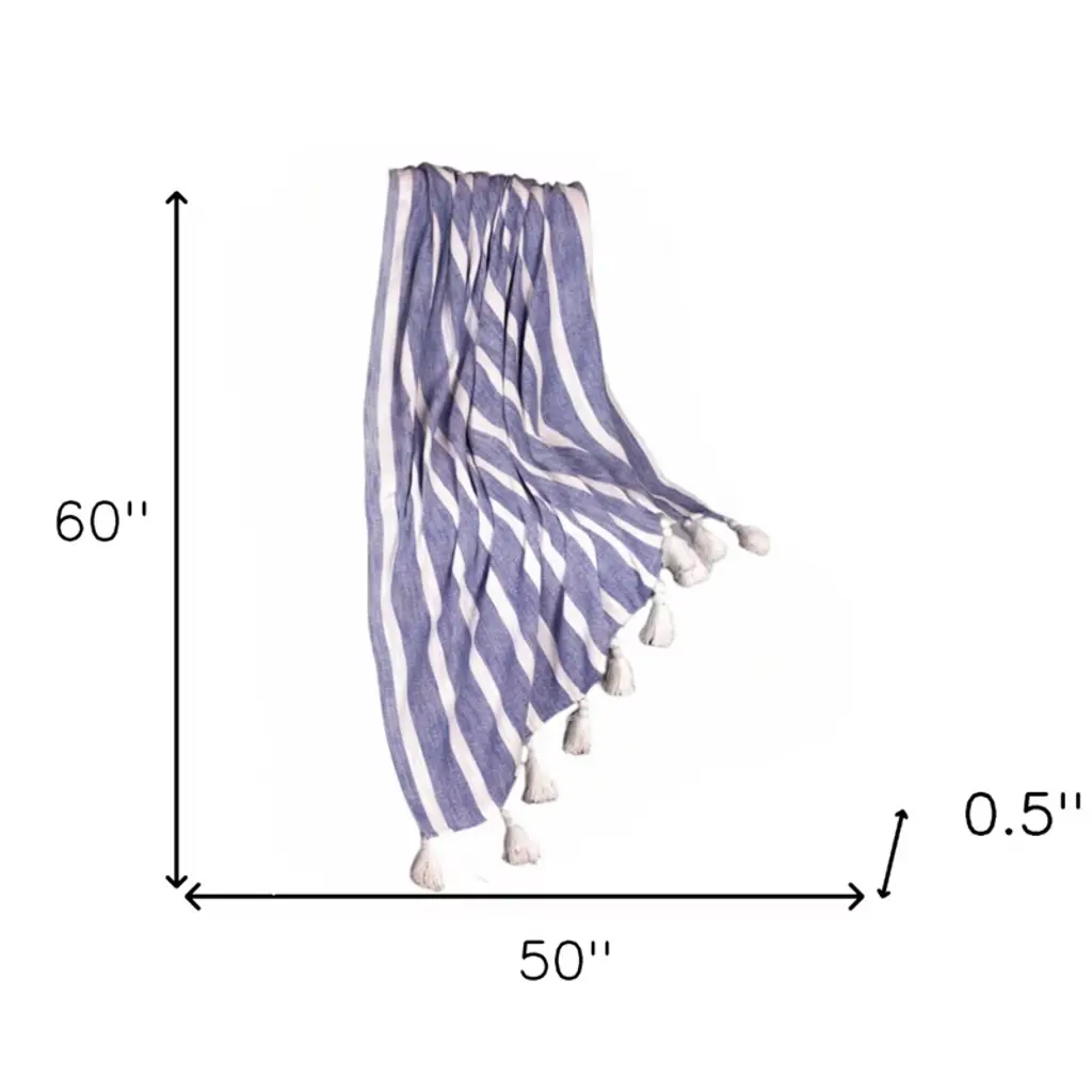 This 50-inch x 60-inch blue and white woven cotton striped throw blanket with tassels is the best (and most stylish) way to wrap you and your loved ones in the epitome of cozy all year long. Features a woven striped design that offers sumptuous softness and texture that you'll cherish for years to come. Made from cotton this blanket will make a great addition to any room it's added to. Add extra texture to your decor and turn your room into an inviting space. Perfect for your favorite chair, bed or lounging on the couch, this blanket helps bring a warm and fashionable flair to your space. 50-inch H x 60-inch W x 0.5-inch D