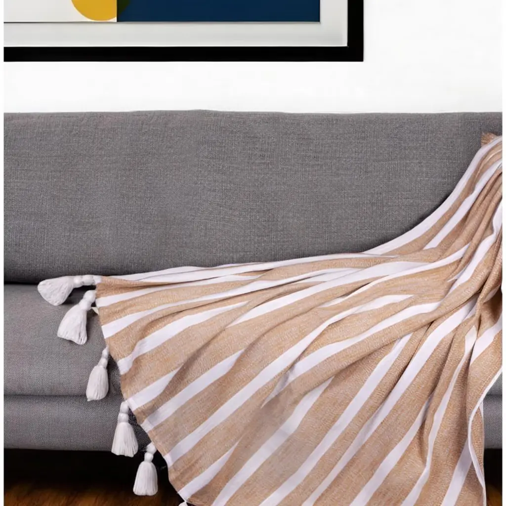 This 50-inch x 60-inch gold and ivory woven cotton striped throw blanket with tassels is an essential for any cozy abode. Features a woven striped design that offers sumptuous softness and texture that you'll cherish for years to come. Made from cotton this blanket will make a great addition to any room it's added to. Add extra texture to your decor and turn your room into an inviting space. This cozy throw blanket is sure to become your go-to couch companion. 50-inch H x 60-inch W x 0.5-inch D