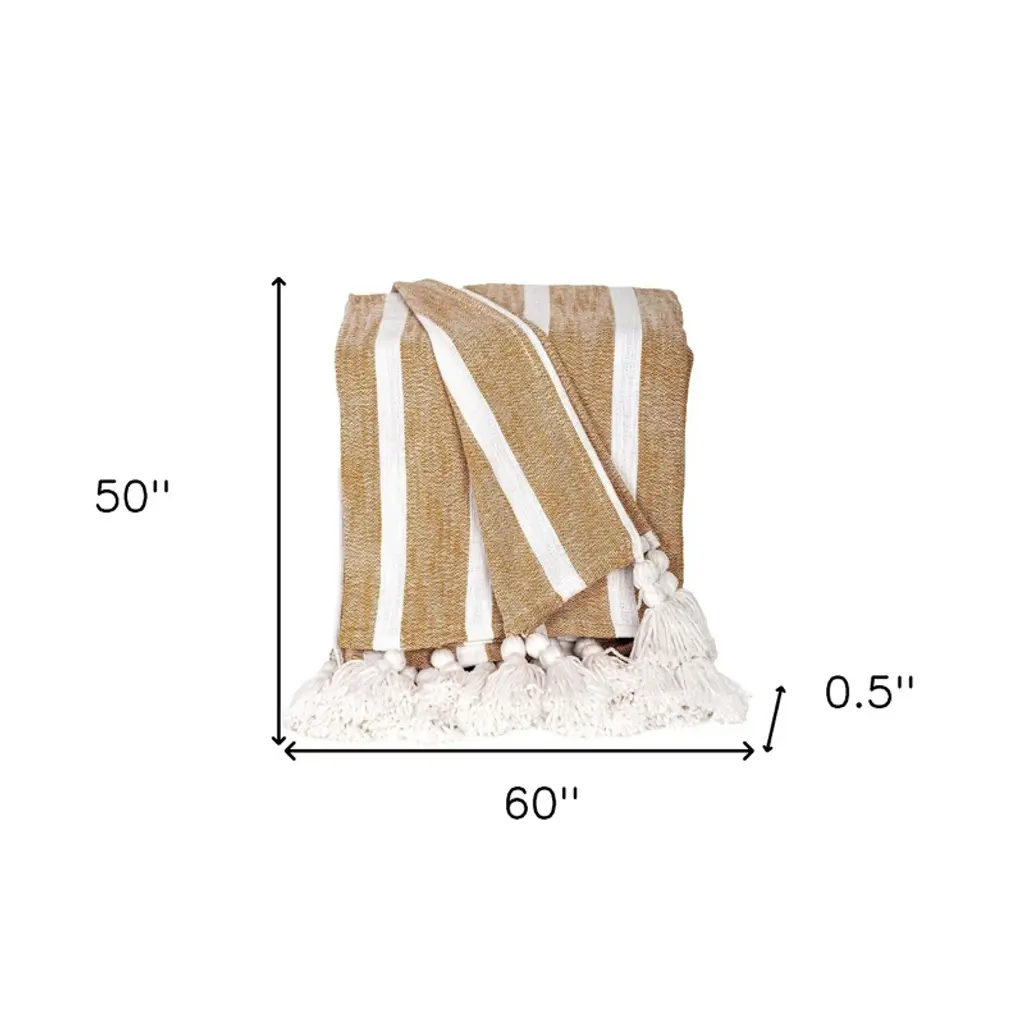 Homeroots 50" X 60" Gold And Ivory Woven Cotton Striped Throw Blanket With Tassels