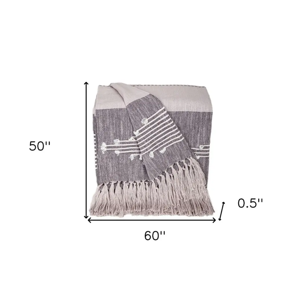 Homeroots 50" X 60" Gray Woven Cotton Striped Throw Blanket With Tassels And Embroidery