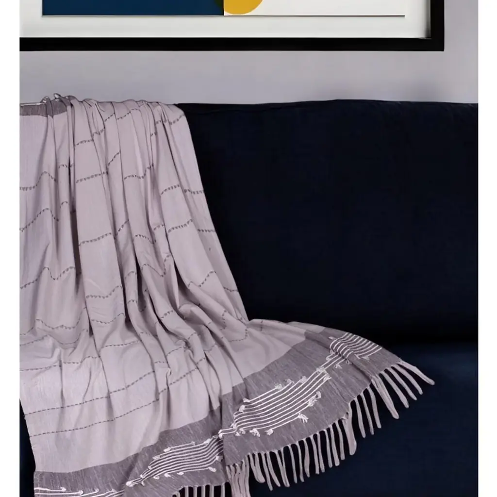 This 50-inch x 60-inch gray woven cotton striped throw blanket with tassels and embroidery brings a classic, refined style to your space. Features a woven striped design that offers sumptuous softness and texture that you'll cherish for years to come. Made from cotton this blanket will make a great addition to any room it's added to. Add extra texture to your decor and turn your room into an inviting space. This cozy throw blanket is sure to become your go-to couch companion. 50-inch H x 60-inch W x 0.5-inch D