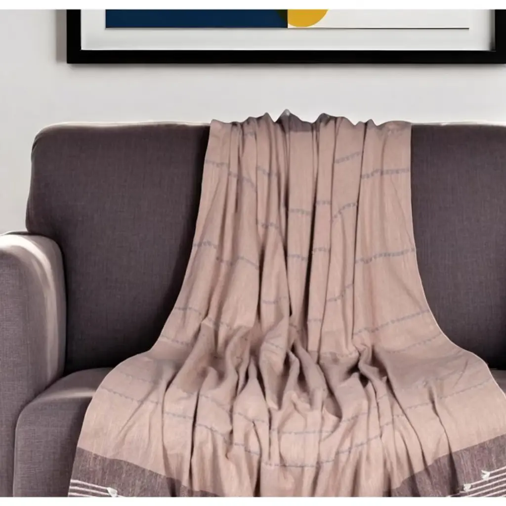 Homeroots 50" X 60" Taupe And Gray Woven Cotton Striped Throw Blanket With Fringe