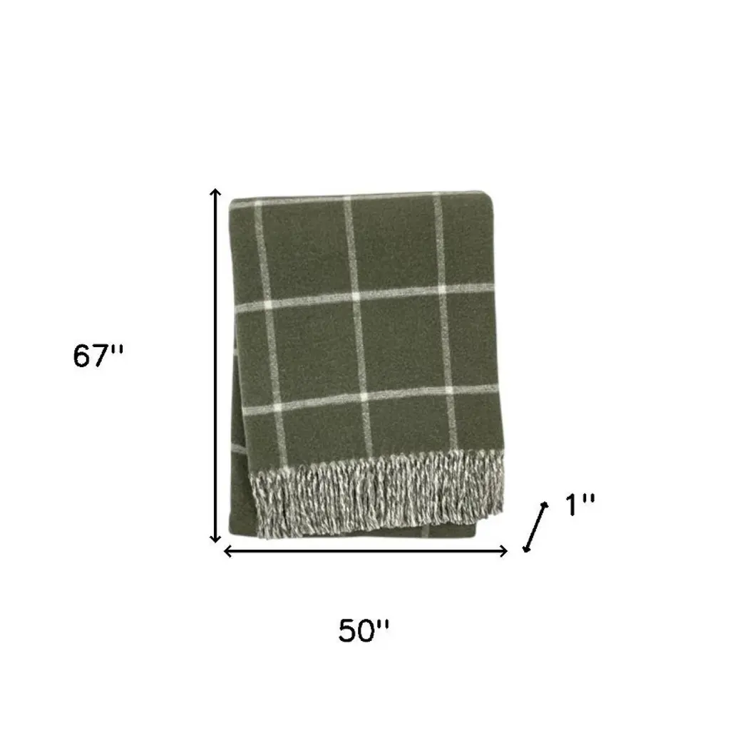 Homeroots 50" X 67" Olive Green And White Cotton Blend Woven Plaid Throw Blanket With Fringe