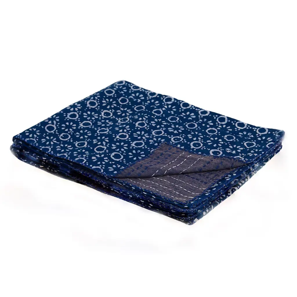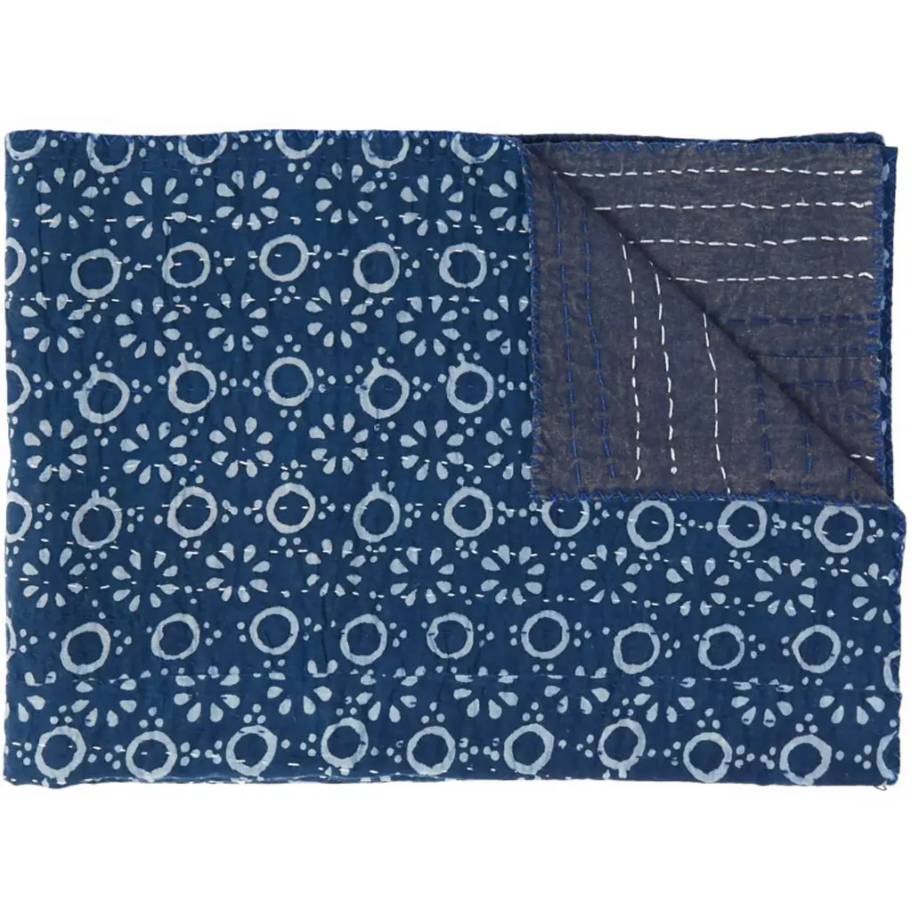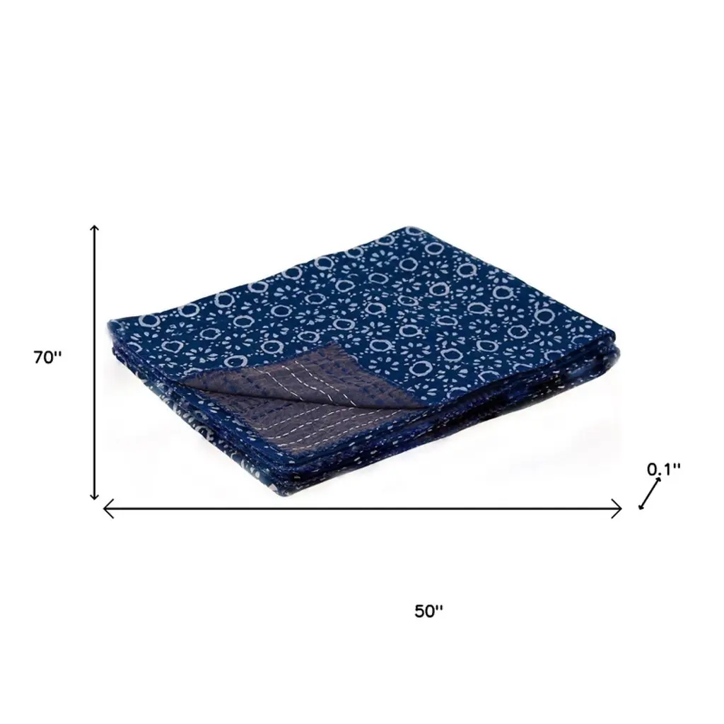This 50-inch x 70-inch blue and off white geometric cotton quilted kantha throw blanket with embroidery brings a classic, refined style to your space. Handmade by true artisans, this good looking throw will elevate its surroundings with its genuine and artisanal style. Featuring beautiful embroidery, this embellished throw is of the highest quality and design. Made from cotton this blanket will make a great addition to any room it's added to. Layering your furnishings with a decorative throw has the ability to awaken a tired living room or elevate the design of your bedroom simply by providing elements of color and texture that weren't there before. This cozy throw blanket makes the perfect add-on to movie nights and lazy afternoons. 70-inch h x 50-inch w x 0.1-inch d.