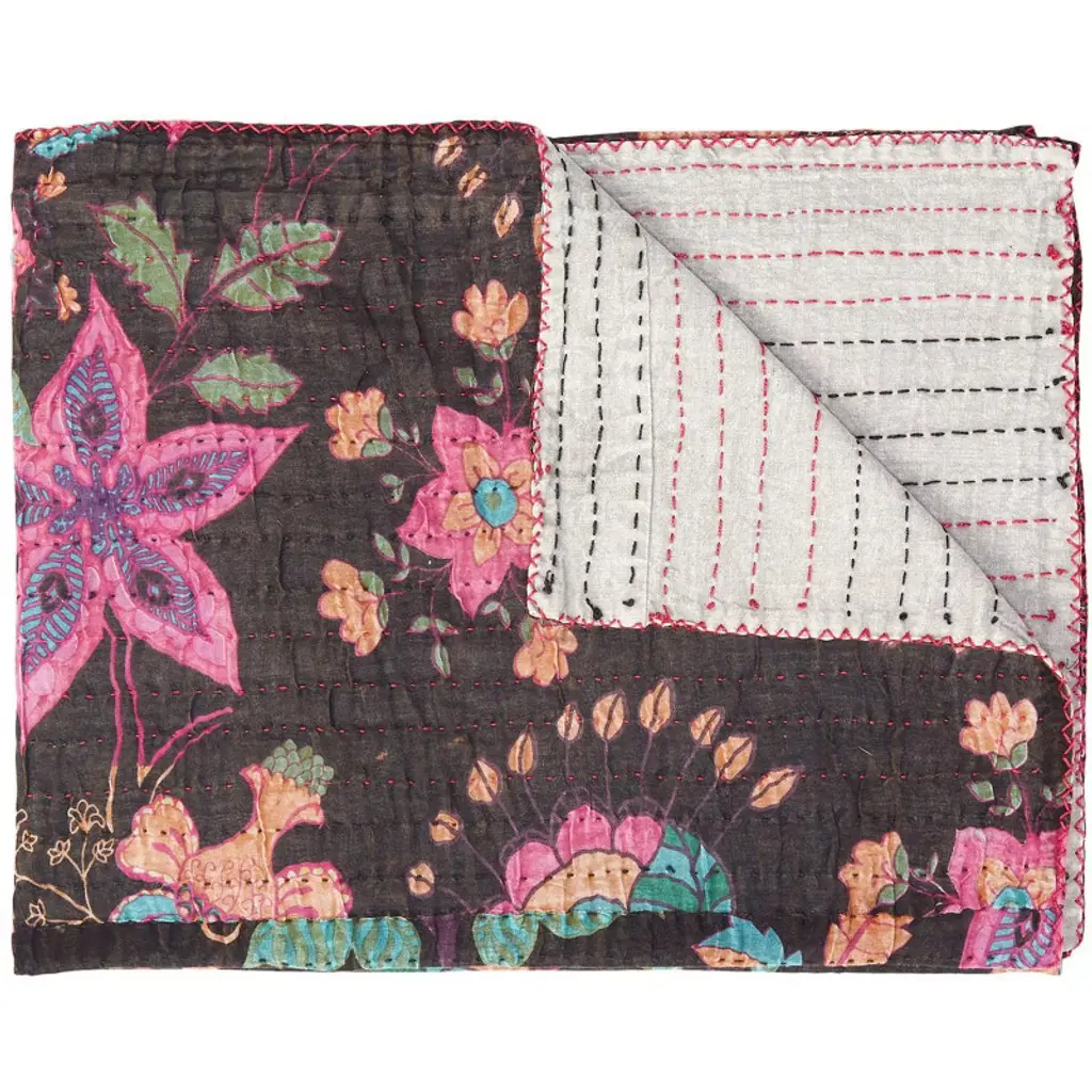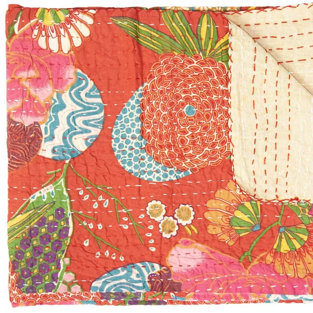 This 50-inch x 70-inch blue green and red floral cotton quilted kantha throw blanket with embroidery is the perfect accent you've been searching for. Handmade by true artisans, this good looking throw will elevate its surroundings with its genuine and artisanal style. Featuring beautiful embroidery, this embellished throw is of the highest quality and design. Made from cotton this blanket will make a great addition to any room it's added to. Layering your furnishings with a decorative throw has the ability to awaken a tired living room or elevate the design of your bedroom simply by providing elements of color and texture that weren't there before. This cozy throw blanket makes the perfect add-on to movie nights and lazy afternoons. 70-inch h x 50-inch w x 0.1-inch d.