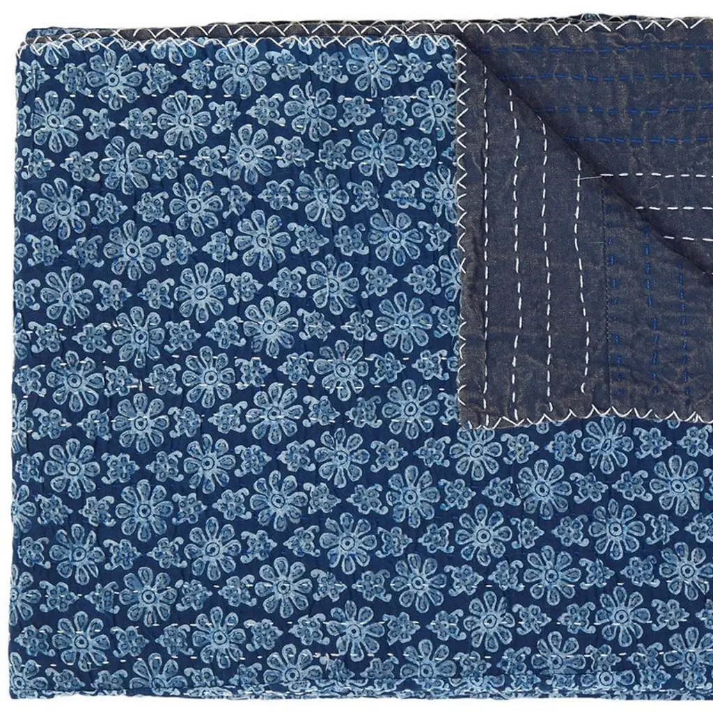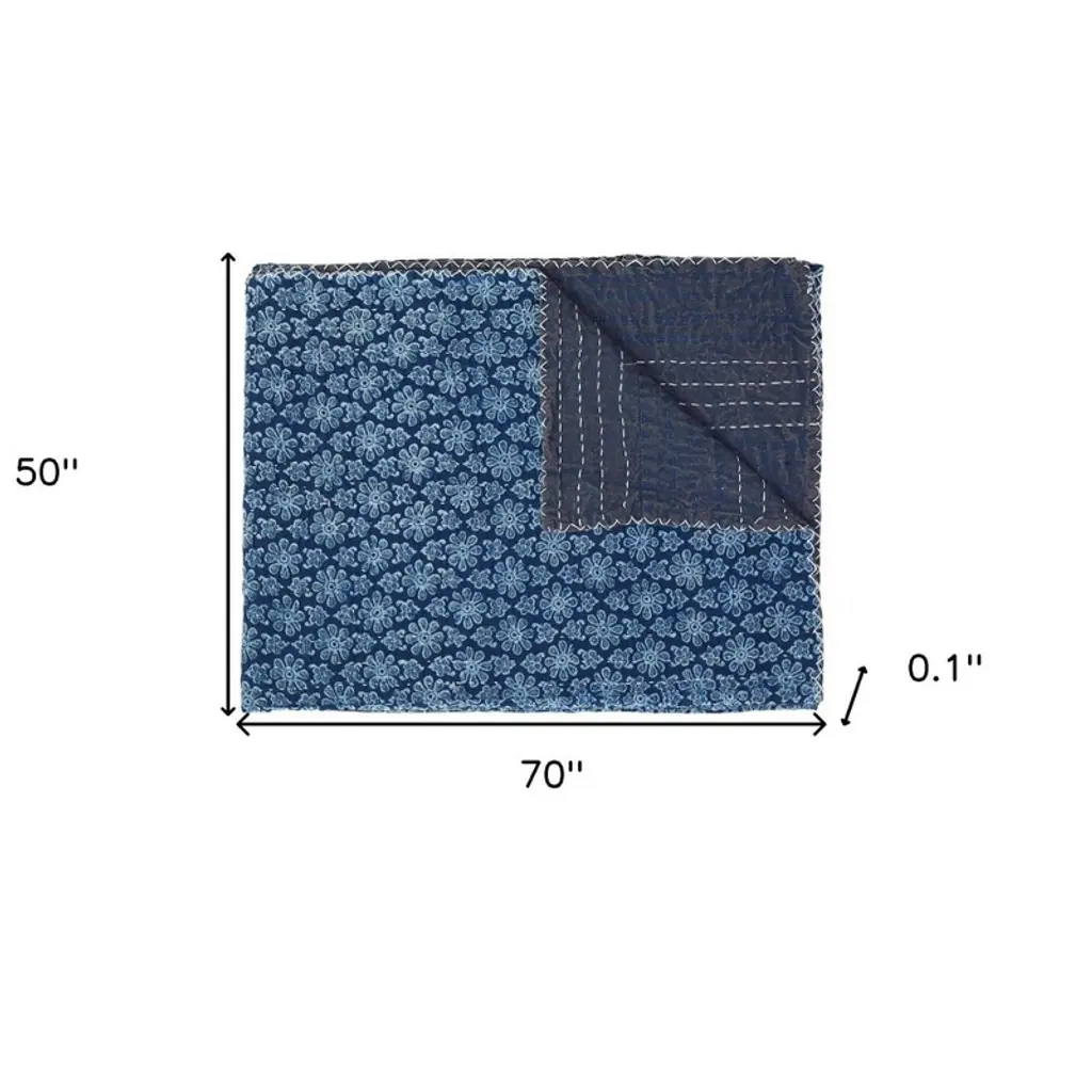 Homeroots 50" X 70" Blue Kantha Cotton Floral Throw Blanket With Embroidery