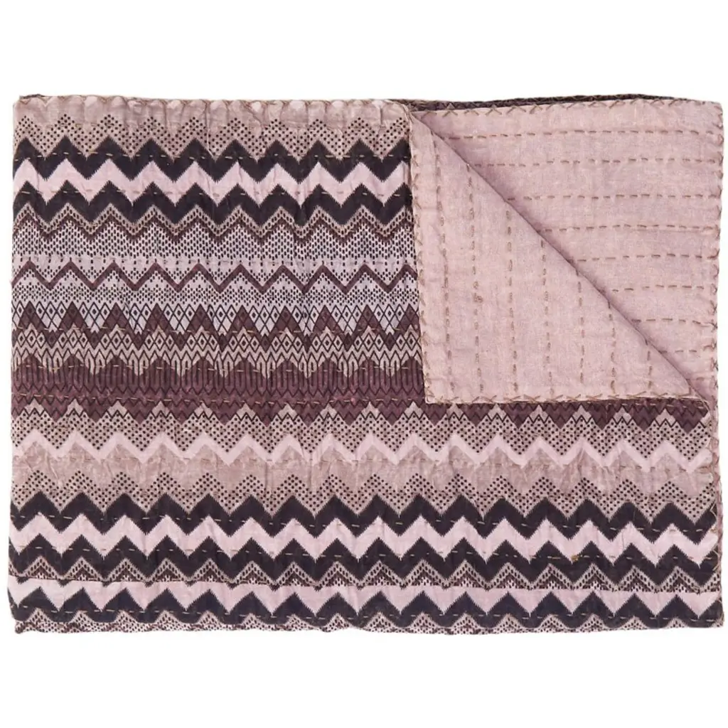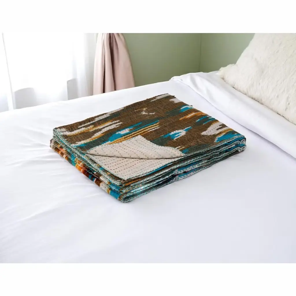 Homeroots 50" X 70" Brown And Blue Ikat Cotton Quilted Kantha Throw Blanket With Embroidery