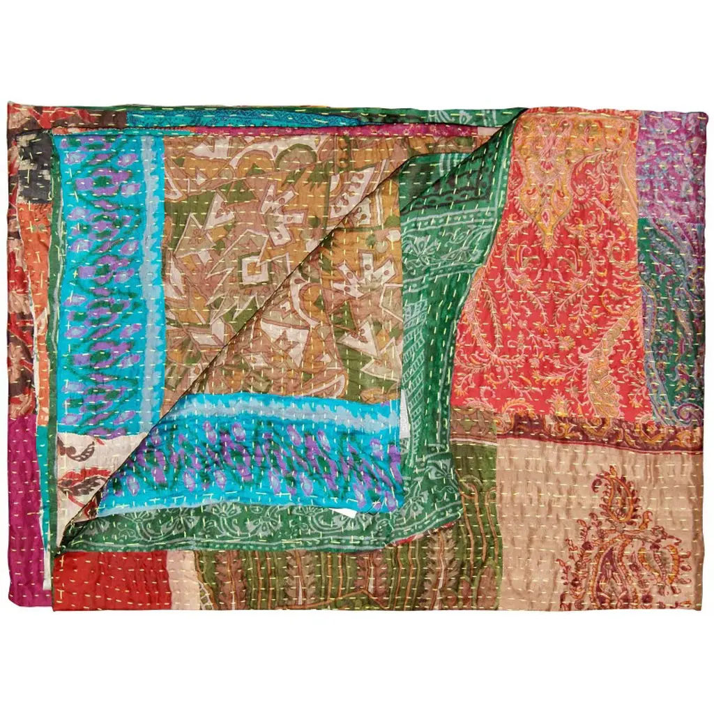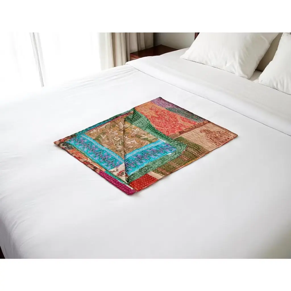 Homeroots 50" X 70" Tan And Beige Patchwork Silk Quilted Kantha Throw Blanket With Embroidery