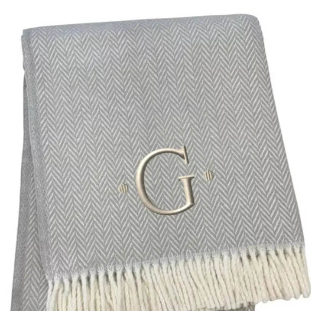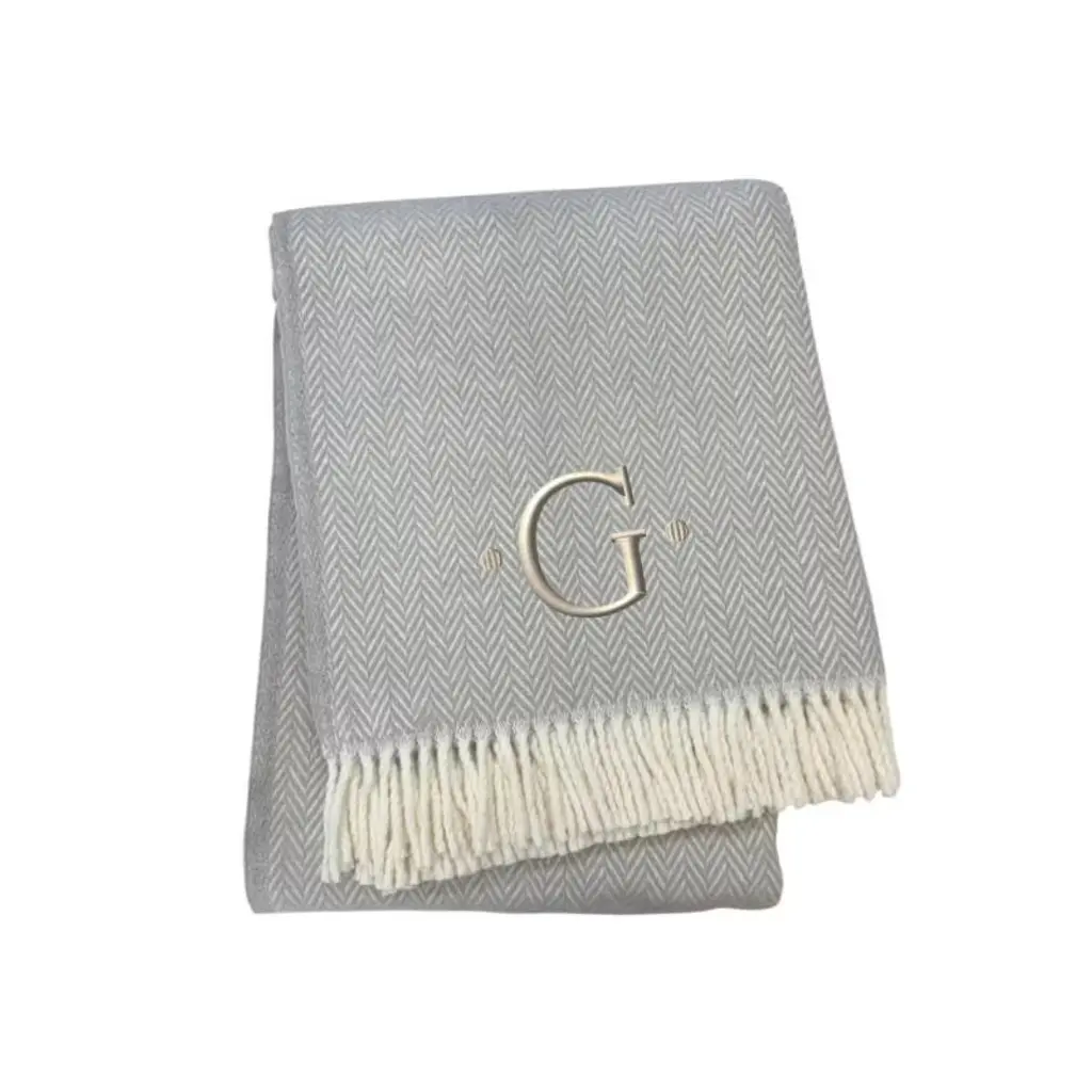 This 55-inch x 70-inch gray and white herringbone cotton blend g initial throw blanket with tassels and embroidery is a stylish addition to any sofa. Features a woven herringbone design that offers sumptuous softness and texture that you'll cherish for years to come. Made from cotton blend this blanket will make a great addition to any room it's added to. Add extra texture to your decor and turn your room into an inviting space. This cozy throw blanket makes the perfect add-on to movie nights and lazy afternoons. 70.00-inch h x 55.00-inch w x 0.50-inch d.
