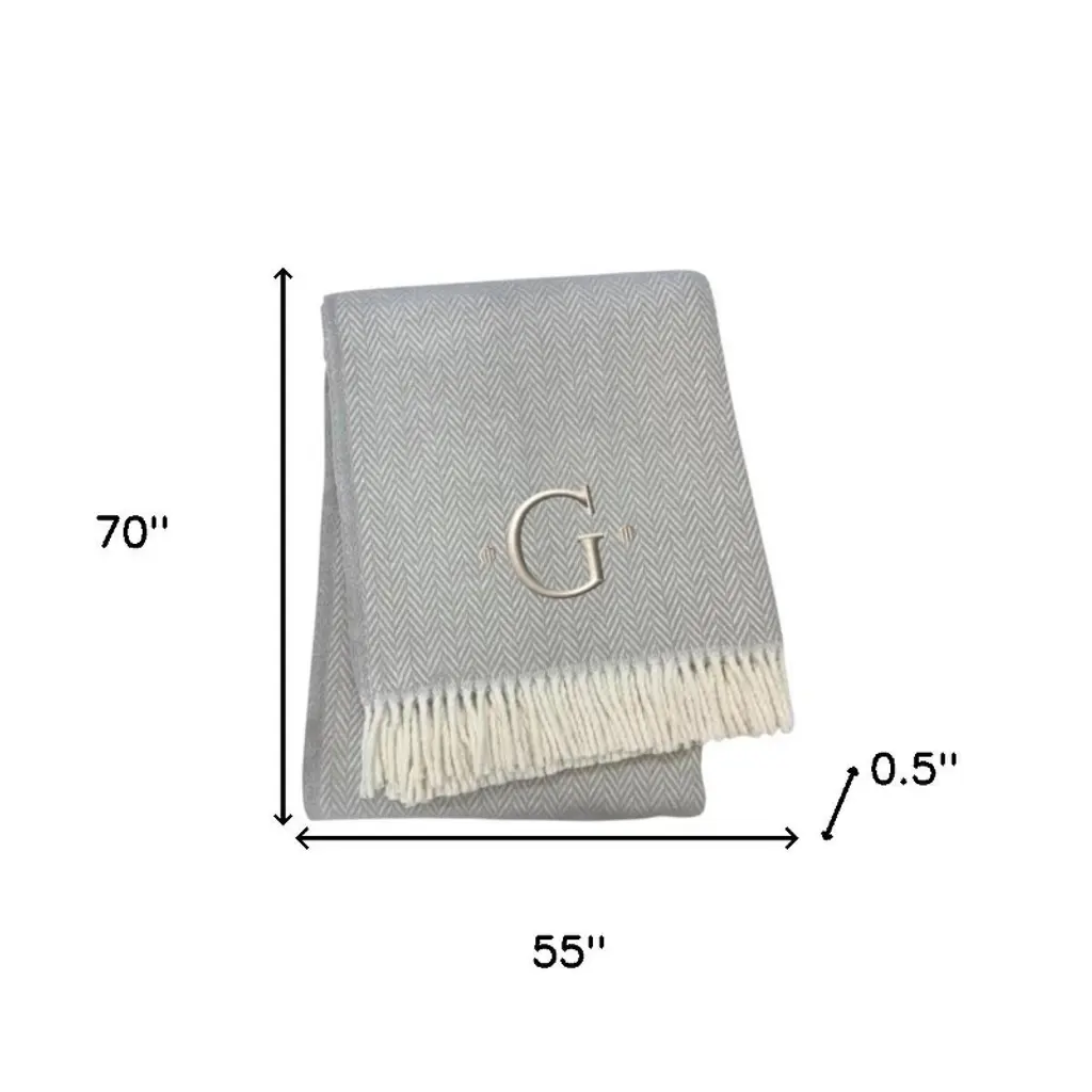 Homeroots 55" X 70" Gray And White Herringbone Cotton Blend G Initial Throw Blanket With Tassels And Embroidery