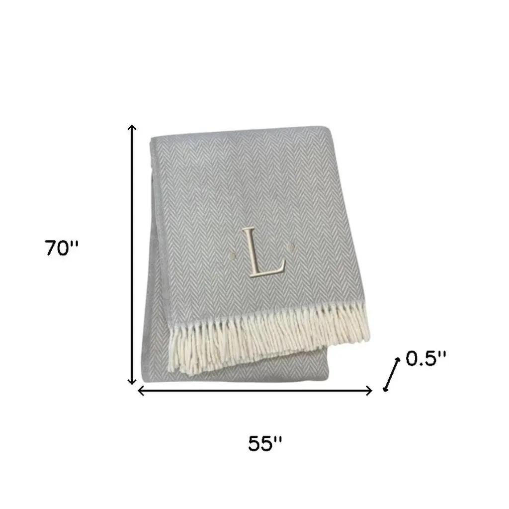 Homeroots 55" X 70" Gray And White Herringbone Cotton Blend L Initial Throw Blanket With Tassels And Embroidery