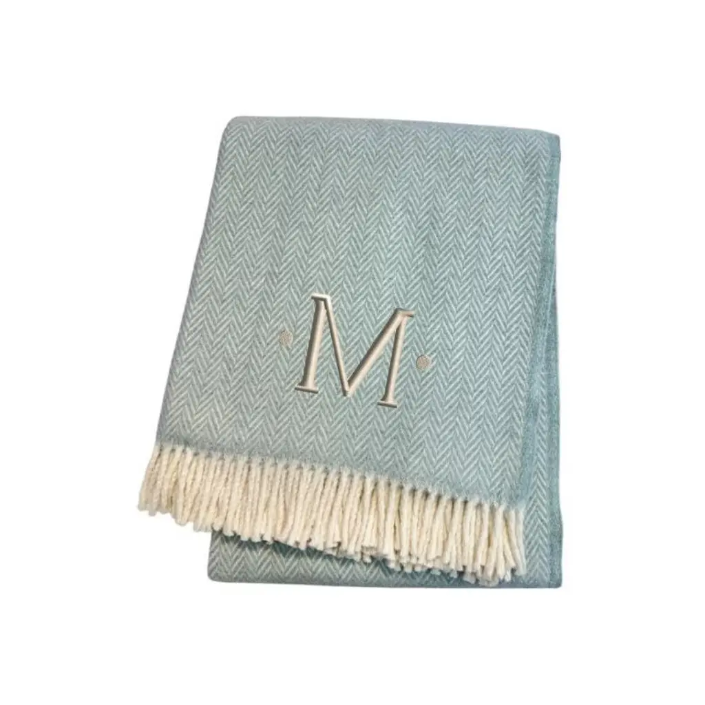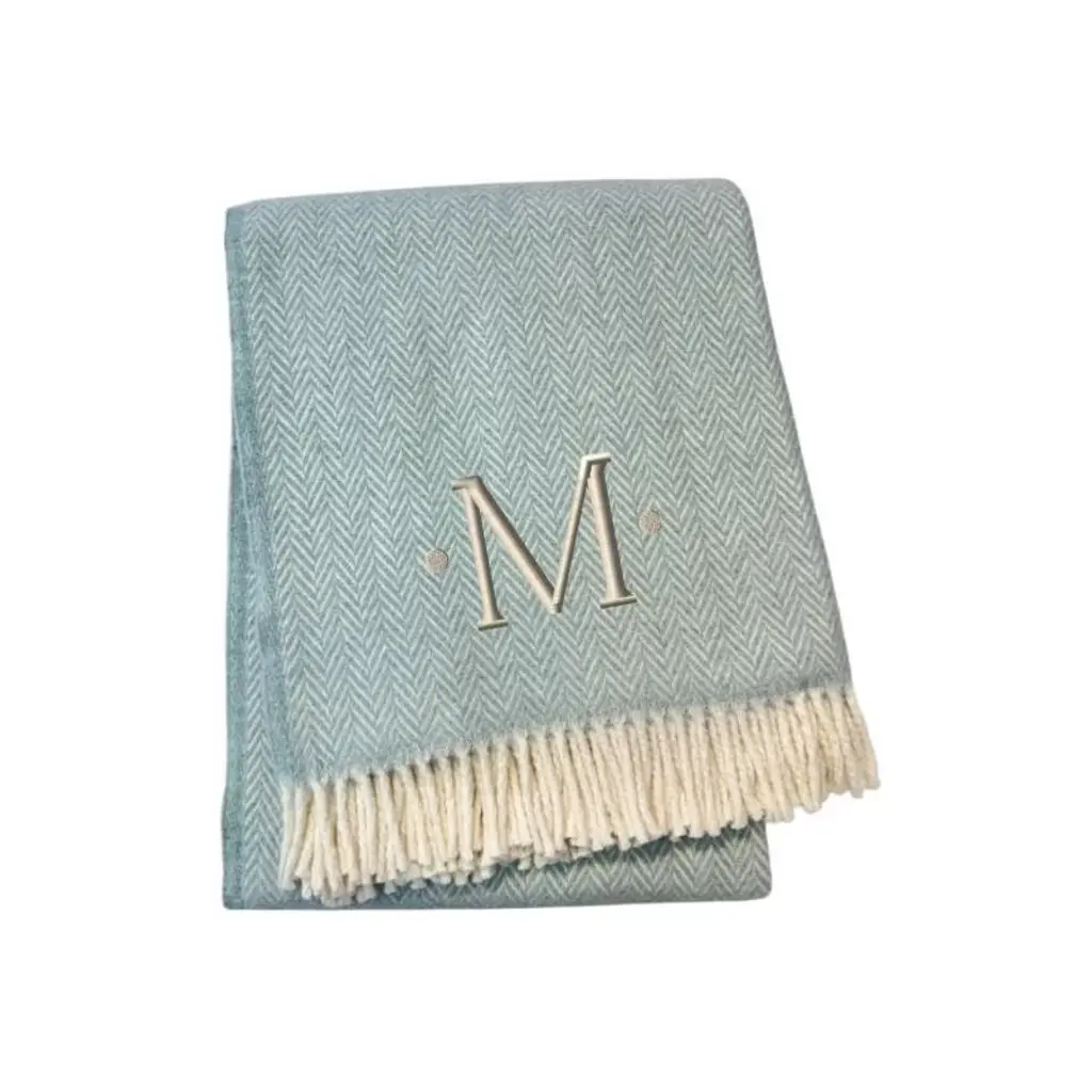 Bring warmth, comfort and style to your space with this 55-inch x 70-inch sky blue and white herringbone cotton blend "M" initial throw blanket with tassels and embroidery. Features a woven herringbone design that offers sumptuous softness and texture that you'll cherish for years to come. Made from cotton blend this blanket will make a great addition to any room it's added to. Versatile to decorate with your first or last name, this embroidered monogram initial blanket will add some personalized style to your space or be a great gift. This cozy throw blanket makes the perfect add-on to movie nights and lazy afternoons. 70.00-inch h x 55.00-inch w x 0.50-inch d.