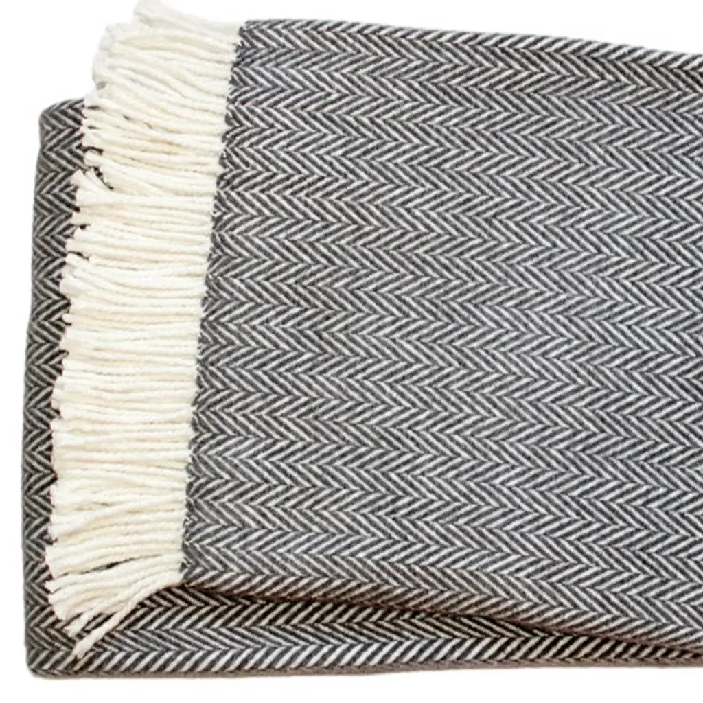 Experience high-end luxury when you wrap yourself in this Dark Grey and White Dreamy Soft Herringbone Throw Blanket. This fabulously soft European woven throw has a classic herringbone design on both sides and a fun white fringe on each end. This super-soft cotton acrylic blend throw will be a luxurious way to accent your sofa, chair, or bed with the perfect accent blanket. This blanket is a great accompaniment to a warm cup of coffee or glass of wine in your favorite spot by the fire. 70" x 55"