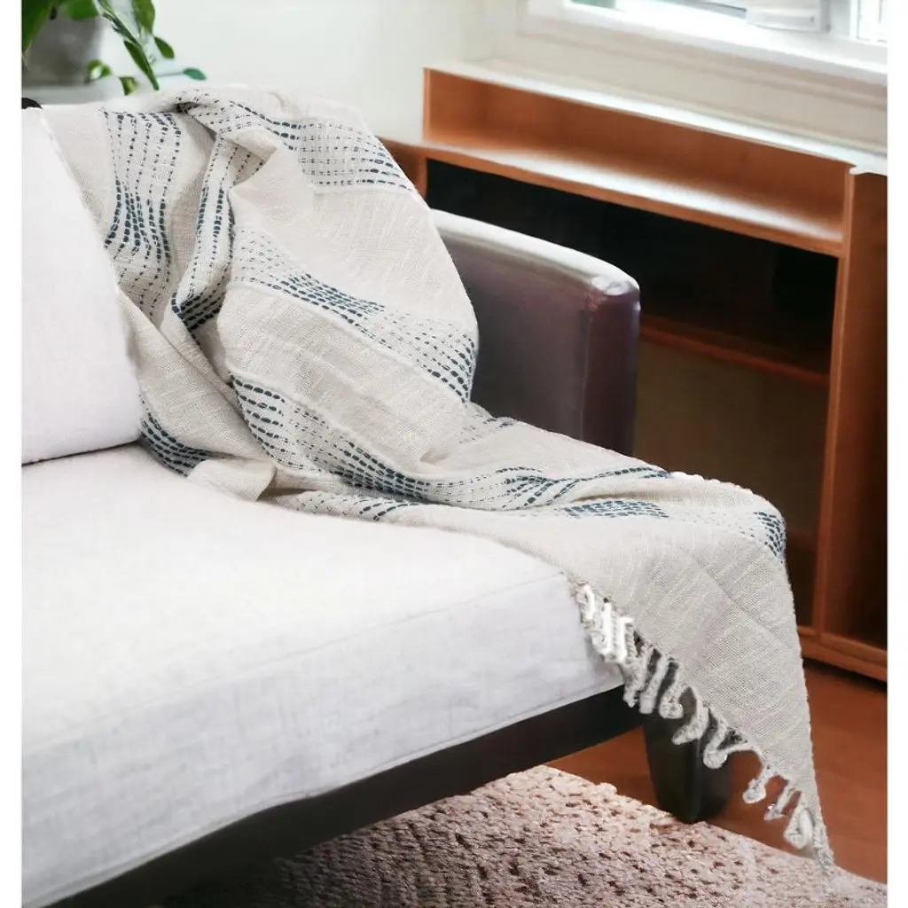 This gray woven cotton throw blanket with fringe is an essential for any cozy abode. Features a woven striped design that offers sumptuous softness and texture that you'll cherish for years to come. Made from cotton this blanket will make a great addition to any room it's added to. Layering your furnishings with a decorative throw has the ability to awaken a tired living room or elevate the design of your bedroom simply by providing elements of color and texture that weren't there before. This cozy throw blanket is sure to become your go-to couch companion. 50-inch H x 60-inch W x 0.5-inch D