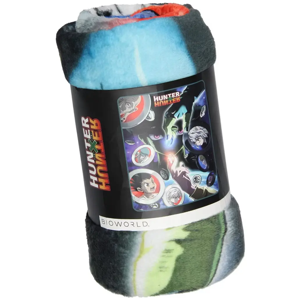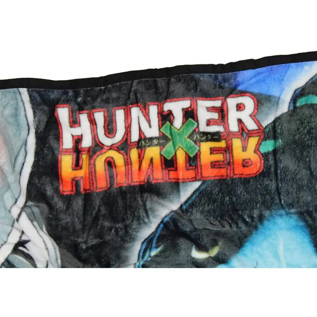 This is an Hunter X Hunter throw blanket. Hunter X Hunter is an extremely popular manga-turned-anime. This Hunter x Hunter blanket features a large front design with multiple characters from the series, like Meruem, Neferpitou, Haiapouf, Menthuthuyoupi, Kite, Issac Netero, Lillua Zoldyck, and Gon Freecss. It depicts these characters on pieces from the game Meruem and Komugi play, Gungi. It is made of a soft 100% polyester fabric blend and measures 45" x 60"