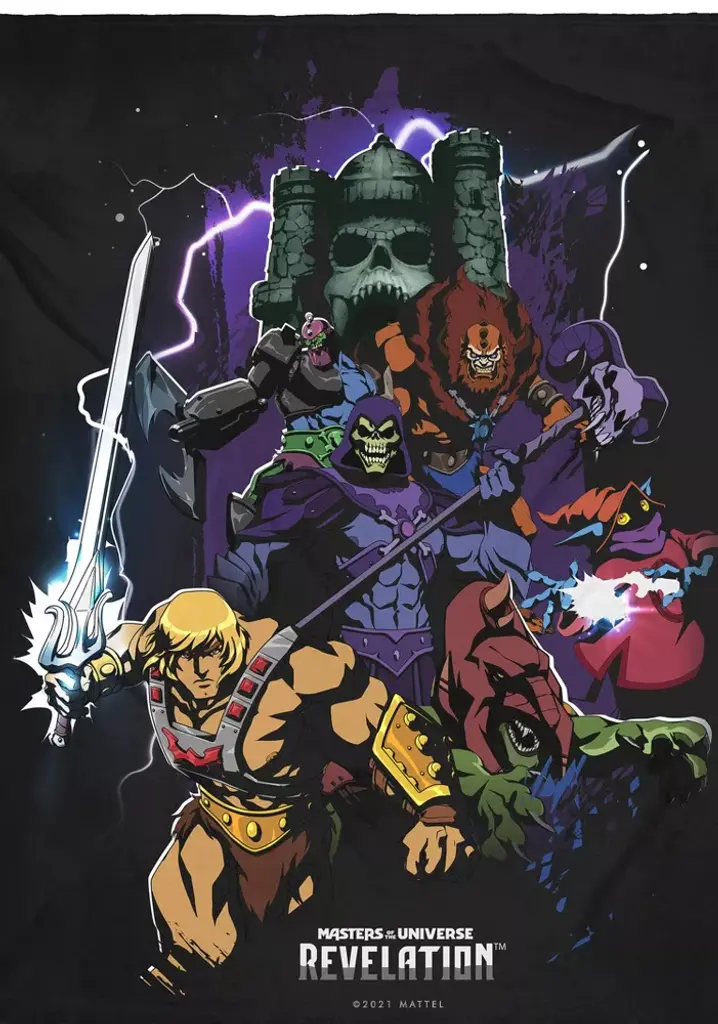 This is an Masters of the Universe: Revelation blanket! The newest rendition on Netflix brings back many of the main characters from the 80' cartoon He-Man and the Masters of the Universe including Prince Adam a.k.a. He-Man, Skeletor, Man-At-Arms, Teela, Evil-Lyn, Cringer, Orko, Beast Man, Tri-Klops, the Sorceress of Castle Grayskull, and many more. It picks up where the original series left off in a fight over Castle Grayskull and Eternia. He-Man was the first cartoon show to be based on a toy. This silk touch comfy blanket is based on a poster of the show with the main characters against the backdrop of Castle Grayskull. The plush throw blanket is made of an extra-soft and comfy 100% polyester fabric and measures 50" X 60". These are the best!