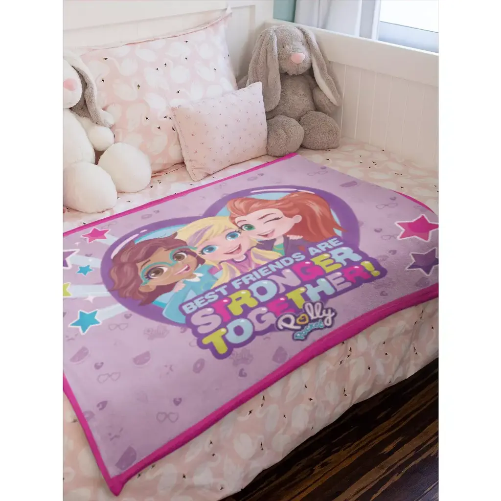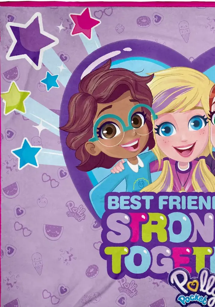 This is an Polly Pocket blanket! Polly Pocket mini-figure toys were first introduced to the world in 1989. They were very popular through the early 90s as a fun toy for little girls. There is now even an animated series on popular streaming platforms! This Polly Pocket blanket is for young or older fans alike! Each plush blanket has a brilliant color design of Polly Pocket and her best friends Lila and Shani with the saying " Best Friends Are Stronger Together!" The plush throw blanket is made of an extra-soft and comfy 100% polyester fabric. These are the best!