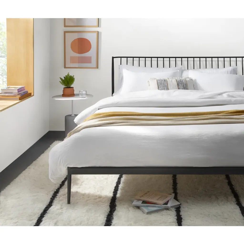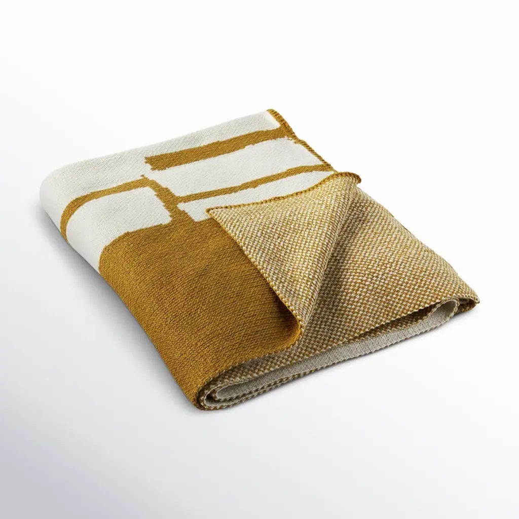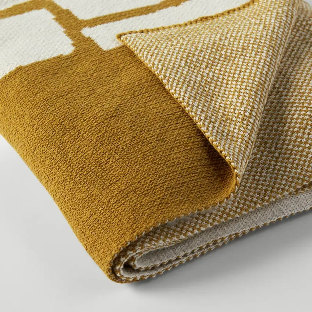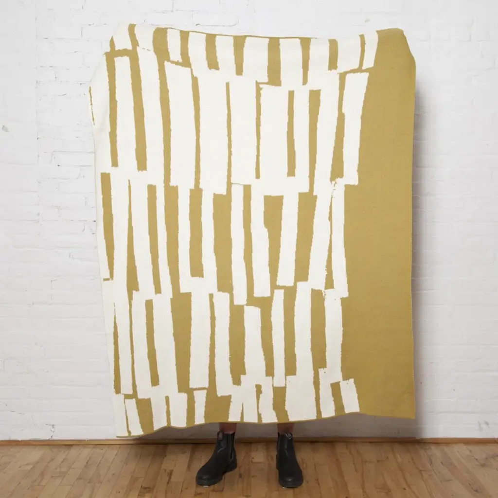 Bold lines + cozy texture. Knitted from a soft cotton blend, this throw blanket layers a flash of pattern into your space. It features a mid-century-inspired design of irregular stripes in an elevated earth tone + white palette. Plus, this blanket is machine-washable for worry-free warmth.