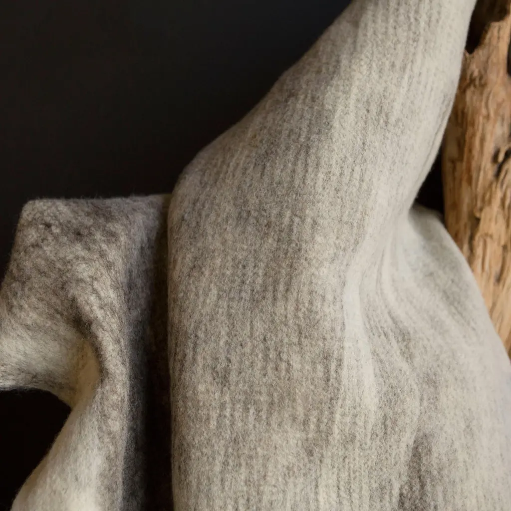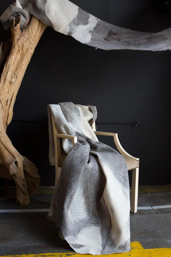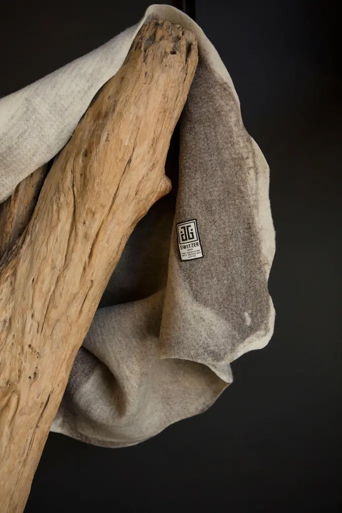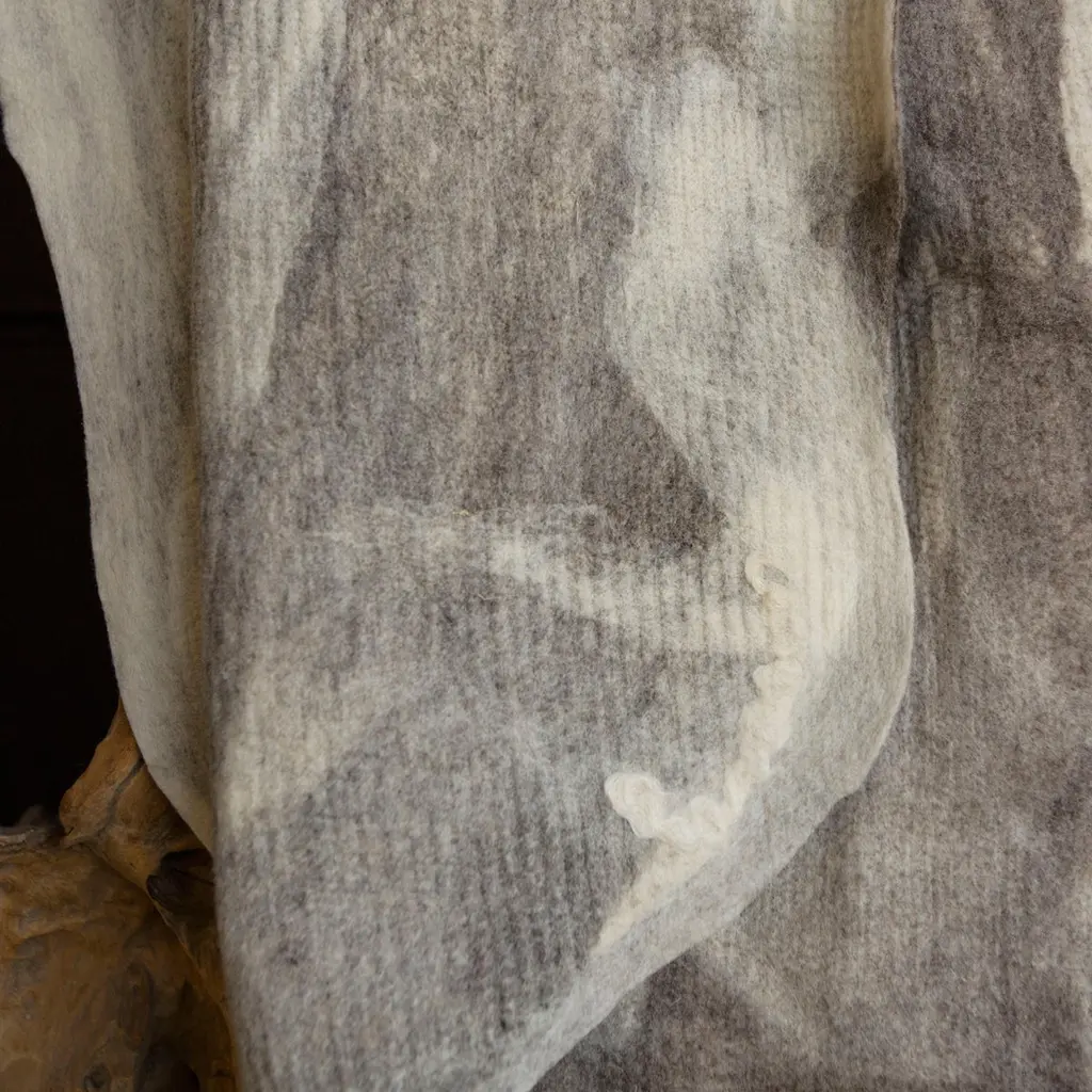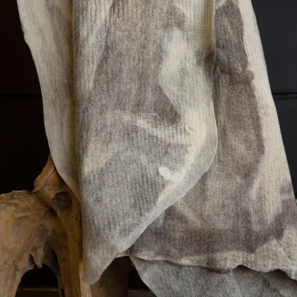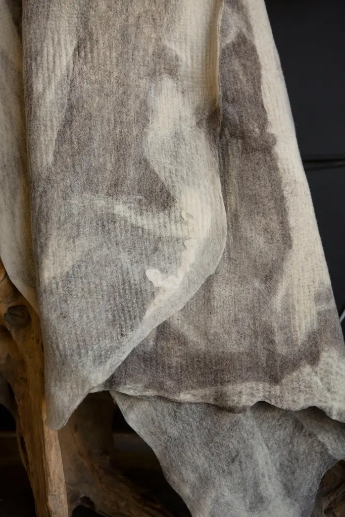 Milled at our design workshop in NorCal where we "paint" with wool, and create one of a kind, pieces from felted fabrics. Brown Umber and natural cream and grey fleece colors are not dyed. This is a statement piece, perfect as a bed skirt or wall art. This item is featured in September 21 Architectural Digest. Heritage Sheep breeds are “at risk” and often number less than 2,000. By purchasing this piece, you support the livelihood of these rare flocks and their farmers. Sheep wool is nature's 100% natural, renewable and sustainable fibre with extraordinary characteristics.Dimensions are approximate: 70" x 50" and wool does not like to be washed or cleaned and has anti-microbial and temperature regulation qualities, but if you must, please dry clean.Note: This is a rustic statement piece, and is not a cuddle blanket. We have Lambswool/cashmere and 100% merino for that.