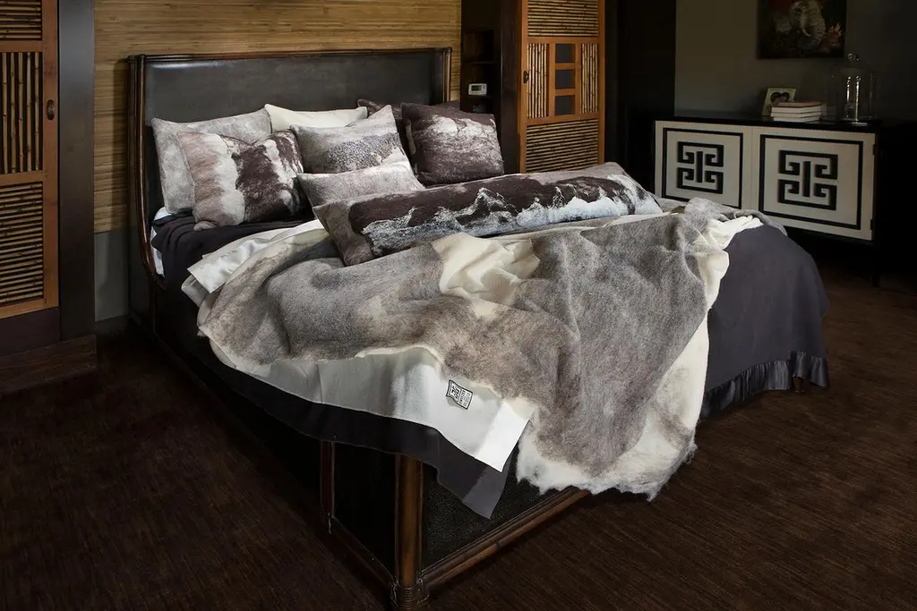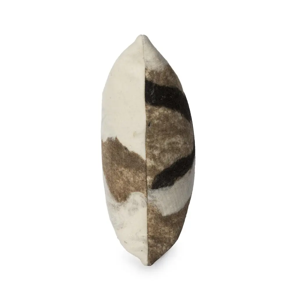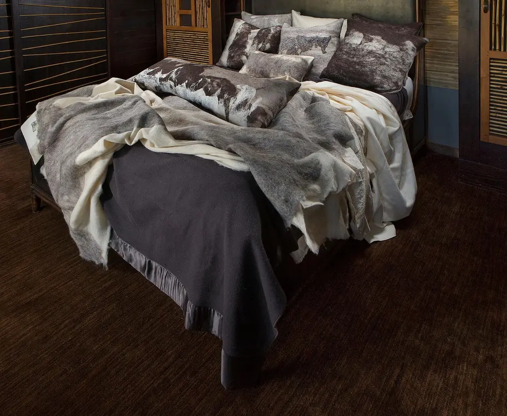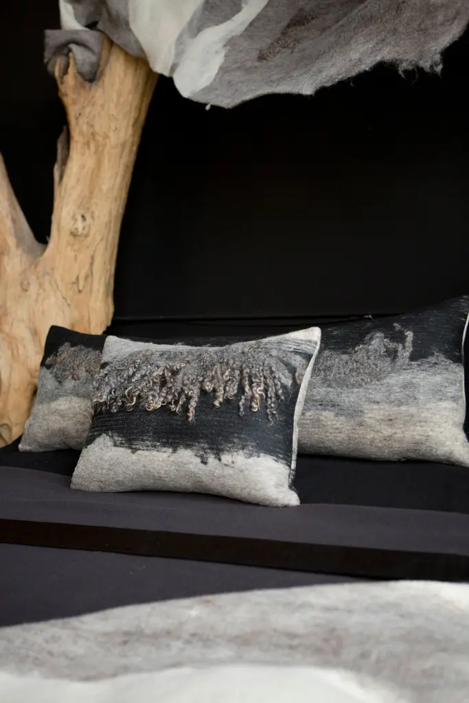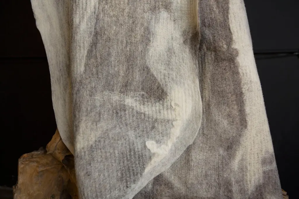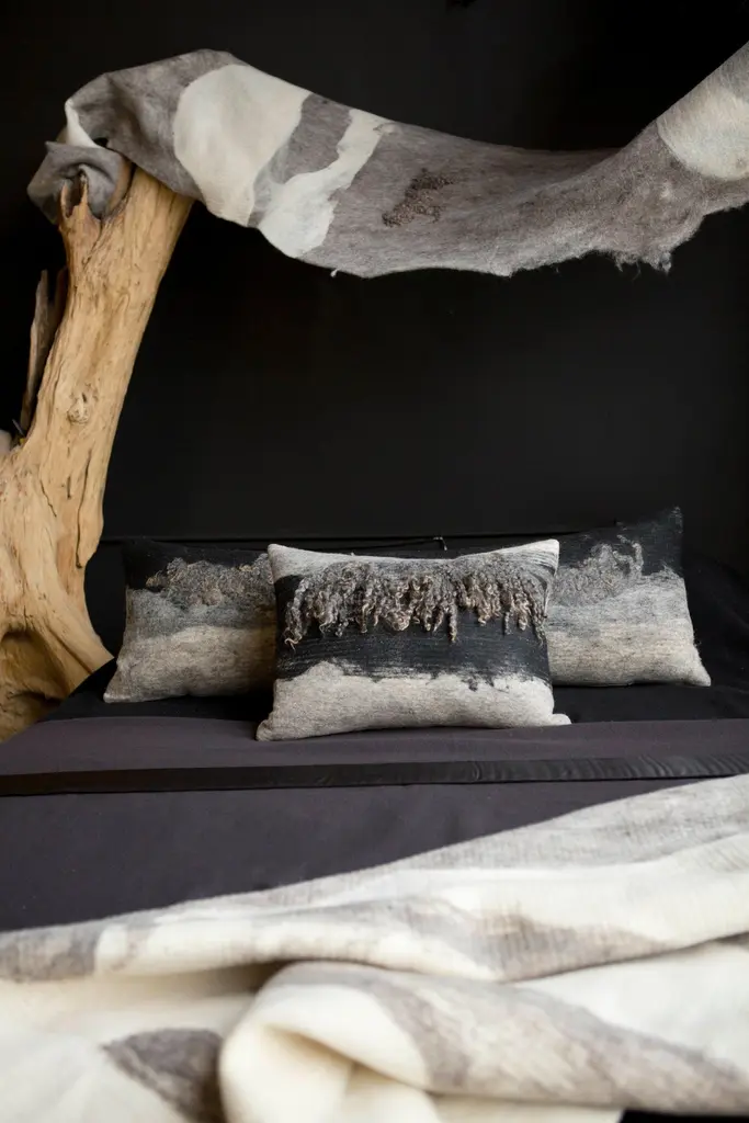 Milled at our design workshop in NorCal where we "paint" with wool, and create one of a kind, pieces from felted fabrics. Brown Umber and natural cream and grey fleece colors are not dyed. This is a statement piece, perfect as a bed skirt or wall art. This item is featured in September 21 Architectural Digest. Heritage Sheep breeds are “at risk” and often number less than 2,000. By purchasing this piece, you support the livelihood of these rare flocks and their farmers. Sheep wool is nature's 100% natural, renewable and sustainable fibre with extraordinary characteristics.Dimensions are approximate: 70" x 50" and wool does not like to be washed or cleaned and has anti-microbial and temperature regulation qualities, but if you must, please dry clean.Note: This is a rustic statement piece, and is not a cuddle blanket. We have Lambswool/cashmere and 100% merino for that.