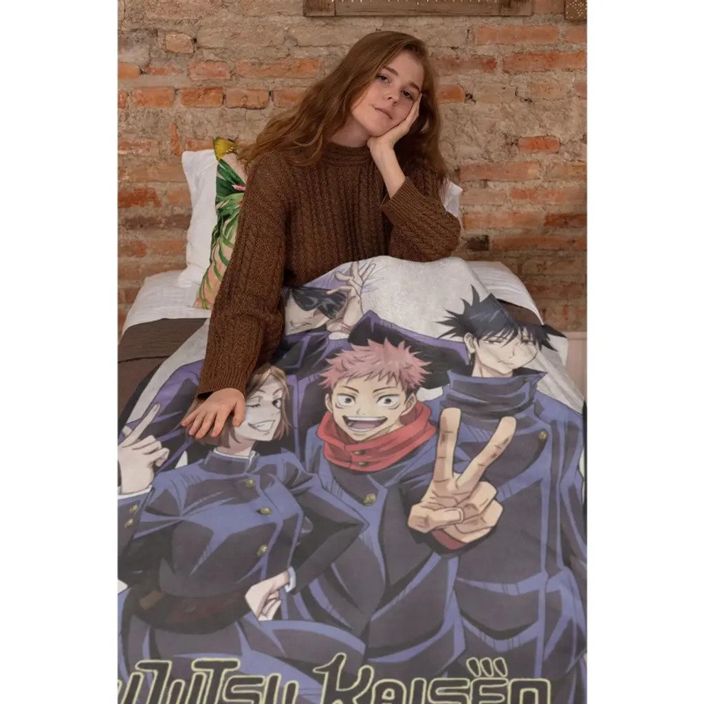 Immerse yourself in the thrilling world of Jujutsu Kaisen with this captivating throw blanket featuring the leading quartet: Satoru Gojo, Yuji Itadori, Megumi Fushiguro, and Nobara Kugisaki. This lightweight, super soft fleece throw measures 45" x 60", making it the great companion for your bed or couch. The front showcases a vibrant and playful poster of the foursome posing in their characteristic silly styles, bringing anime fun to any room. The back of the blanket is a clean, plain white, offering a sleek and versatile look when reversed. Crafted from 100% polyester, this throw blanket combines softness and durability, ensuring it remains a cozy favorite for years. Its bound edges provide a polished finish, enhancing its quality and longevity. With easy-care machine washable fabric, maintenance is a breeze, so you can keep your blanket looking fresh and new. Whether you're a die-hard Jujutsu Kaisen fan or appreciate stylish anime decor, this throw blanket is a must-have addition to your collection.