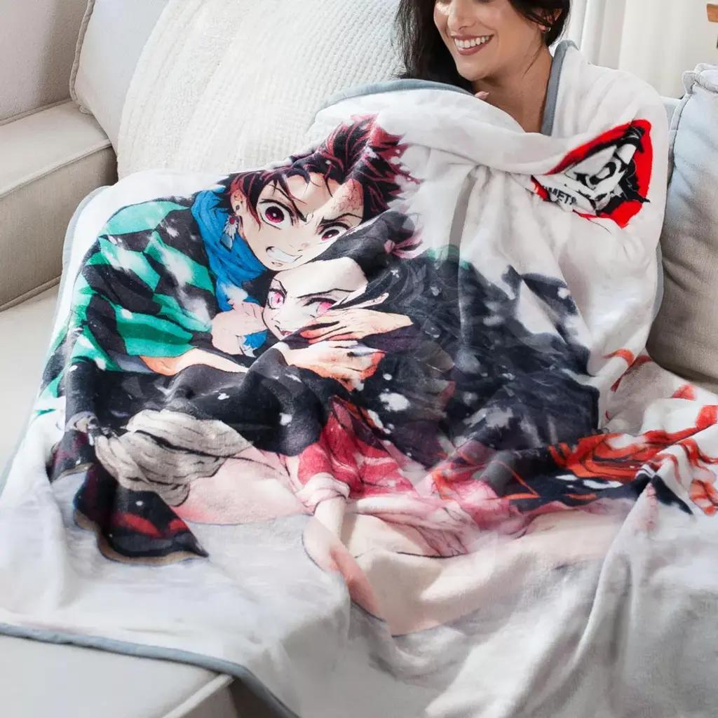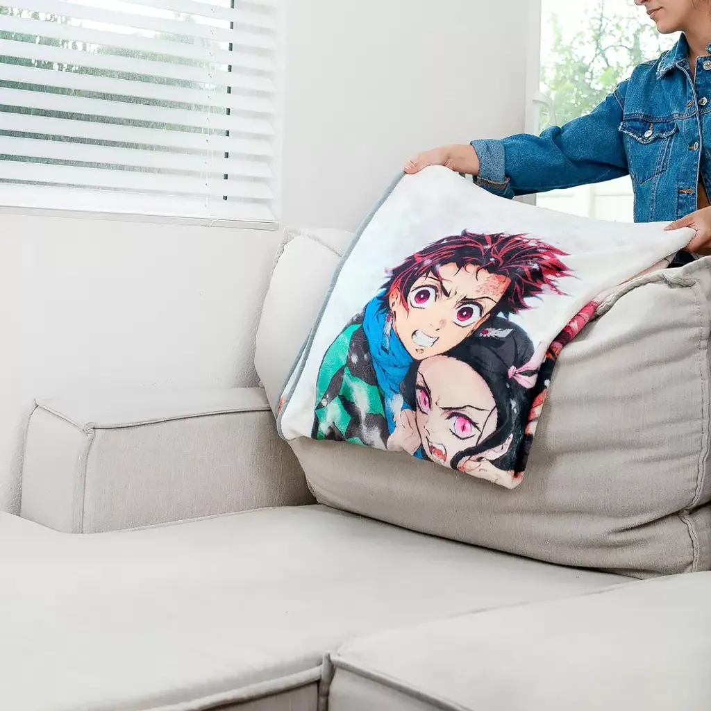 Show off your love of Demon Slayer with this warm and cozy throw blanket! Featuring Tanjiro and Nezuko, this fun throw blanket is soft to the touch, made up of 100% polyester material and measures a roomy 59 inches in diameter. Lastly, it's also easy to clean, machine wash with cold water is highly recommended. Officially licensed. Produced by Just Funky.