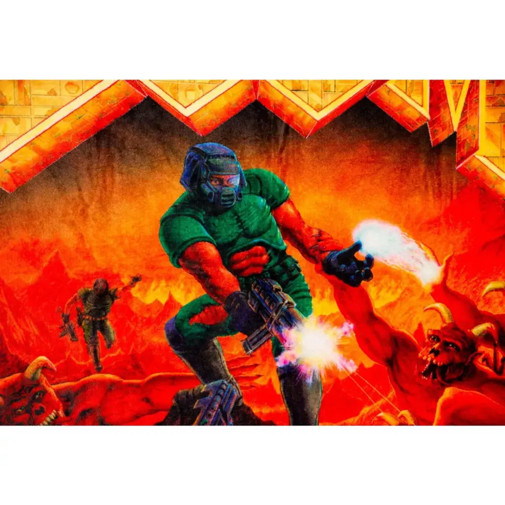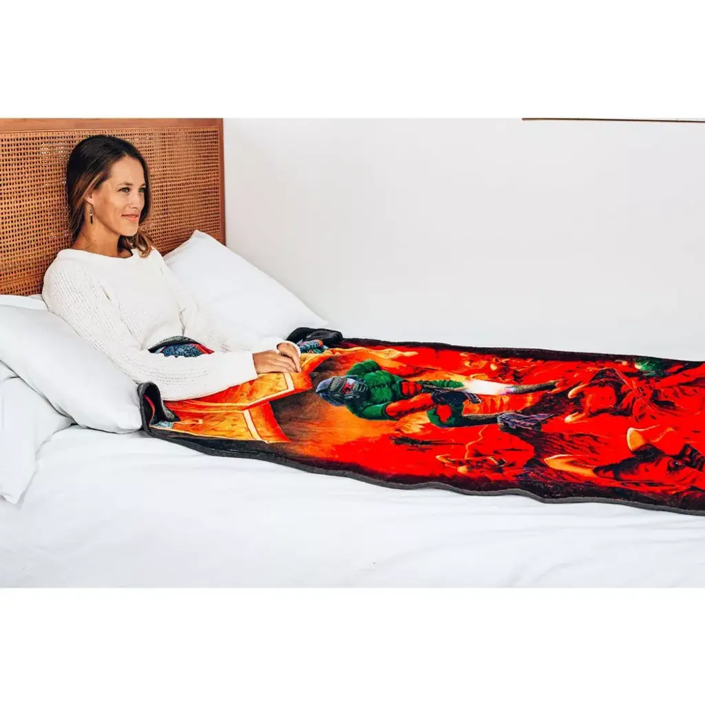 Calling all video game fans! Show off your love of DOOM with this warm and cozy fleece throw blanket! This blanket depicts art for the original 1993 DOOM video game, featuring the Doomguy battling demons from Hell! Comfy throw is made up of 100% polyester material and measures a roomy 45 x 60 inches. It makes a perfect addition to any room in your house. Lastly, it's also easy to clean, machine wash with cold water is highly recommended.