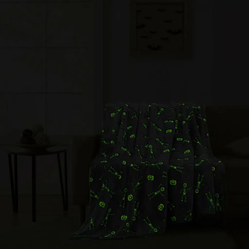 Add spooky fun to your Halloween with this Kate Aurora glow-in-the-dark skeleton throw. Soft, plush fleece keeps you cozy. Perfect for chilly nights and festive decor. Machine washable. 50x70 inches.