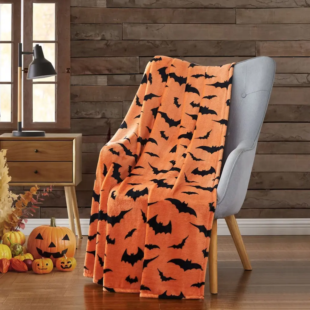Get ready for Halloween with the Kate Aurora Spooky Bats throw blanket. This 50x70 inch orange and black blanket is ultra-soft and plush, perfect for cozy autumn nights. The spooky bats design adds a festive touch to any room. Hypoallergenic, pre-shrunk, and machine washable for easy care.