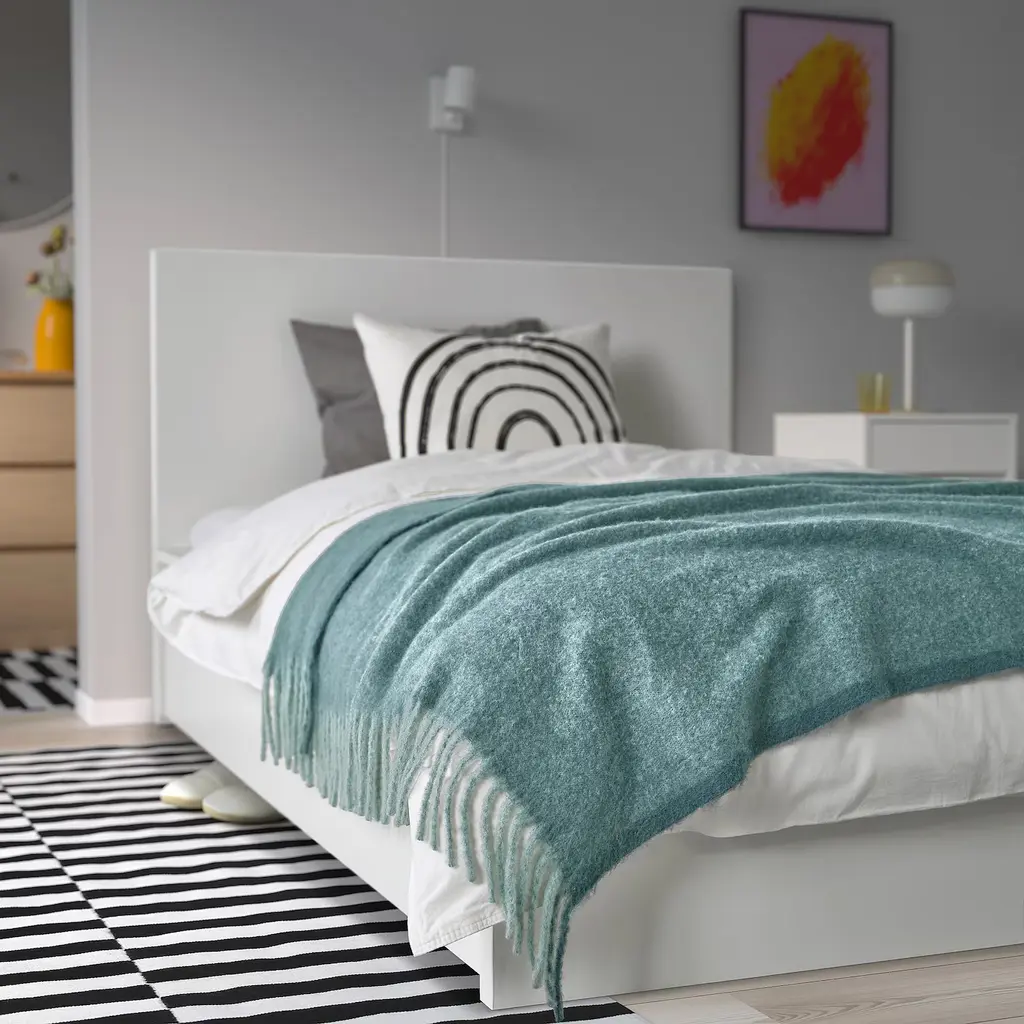 KLIPPOXEL Throw - gray-turquoise 51x67 ". A perfect companion with SANELA cushion covers. Made of 100% recycled polyester. The fluffy brushed surface of the throw may shed slightly when you use the product for the first time.