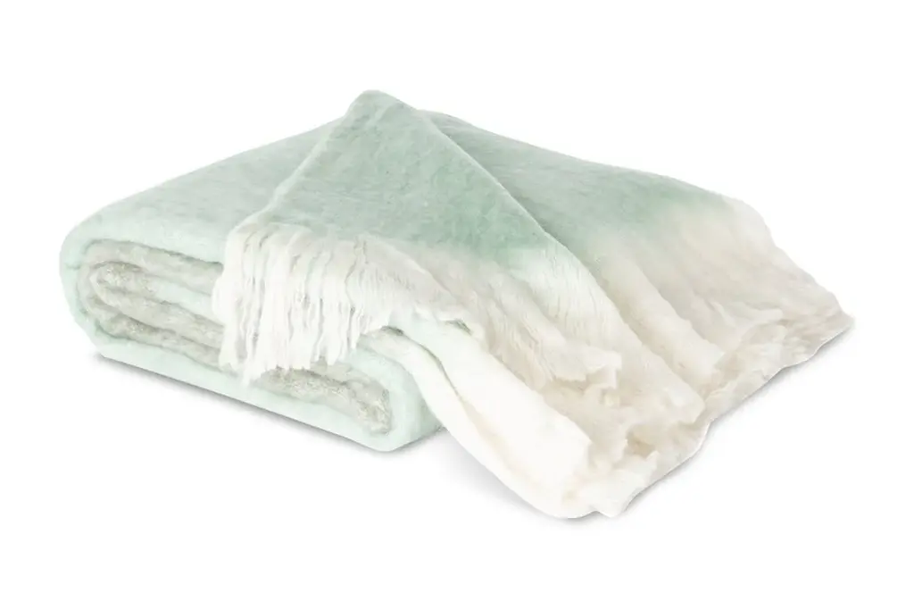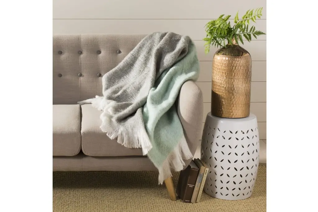 This two-toned throw takes on a modern feel with one end colored in soft aqua and the other in a muted gray. Constructed of a wool and synthetic yarn blend, this stylish accent is sure to brighten up any space.