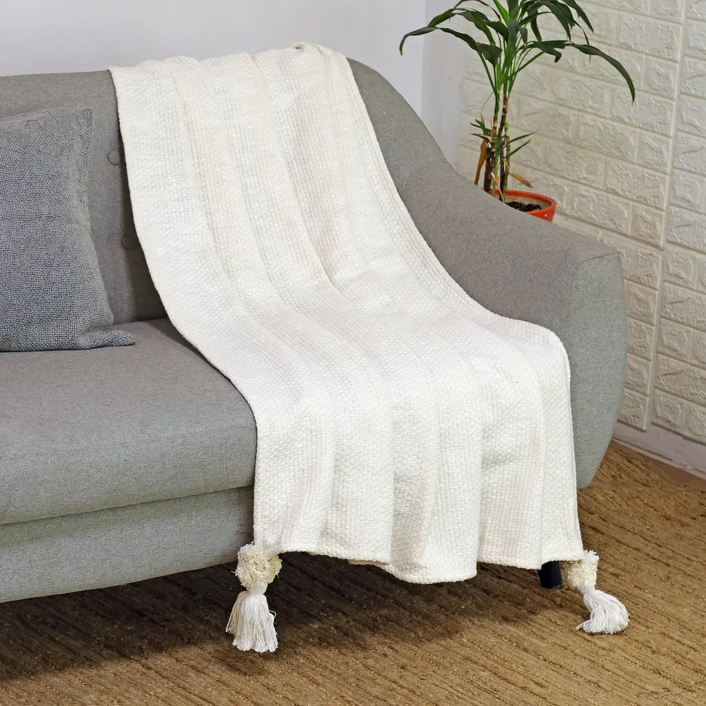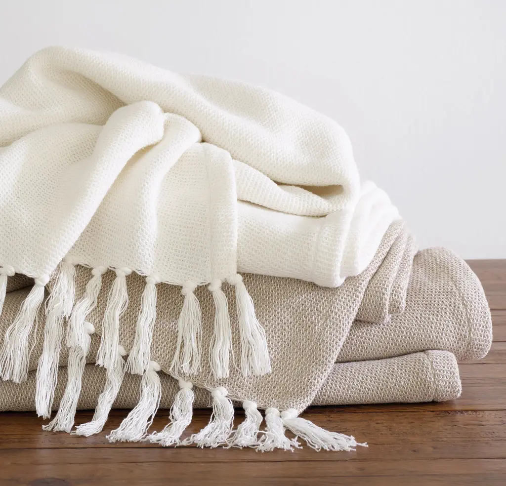 A soft and snuggly addition to the perfectly layered bed, arm chair or sofa, our pure cotton Logan Throw has a float stitch weave for extra insulating qualities. With a knotted self fringe along the width edges, it can make a bold and sophisticated bohemian texture statement. In Dove White or Sand.