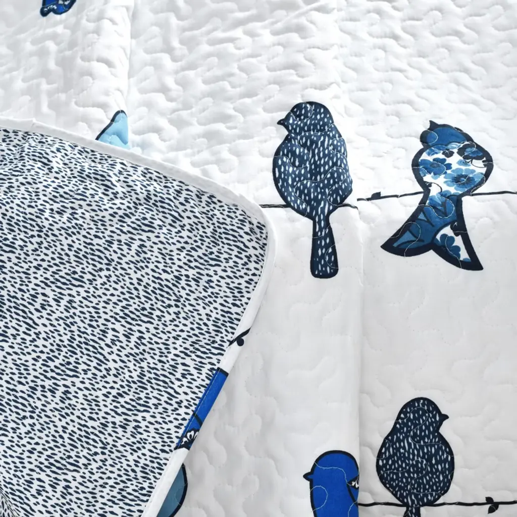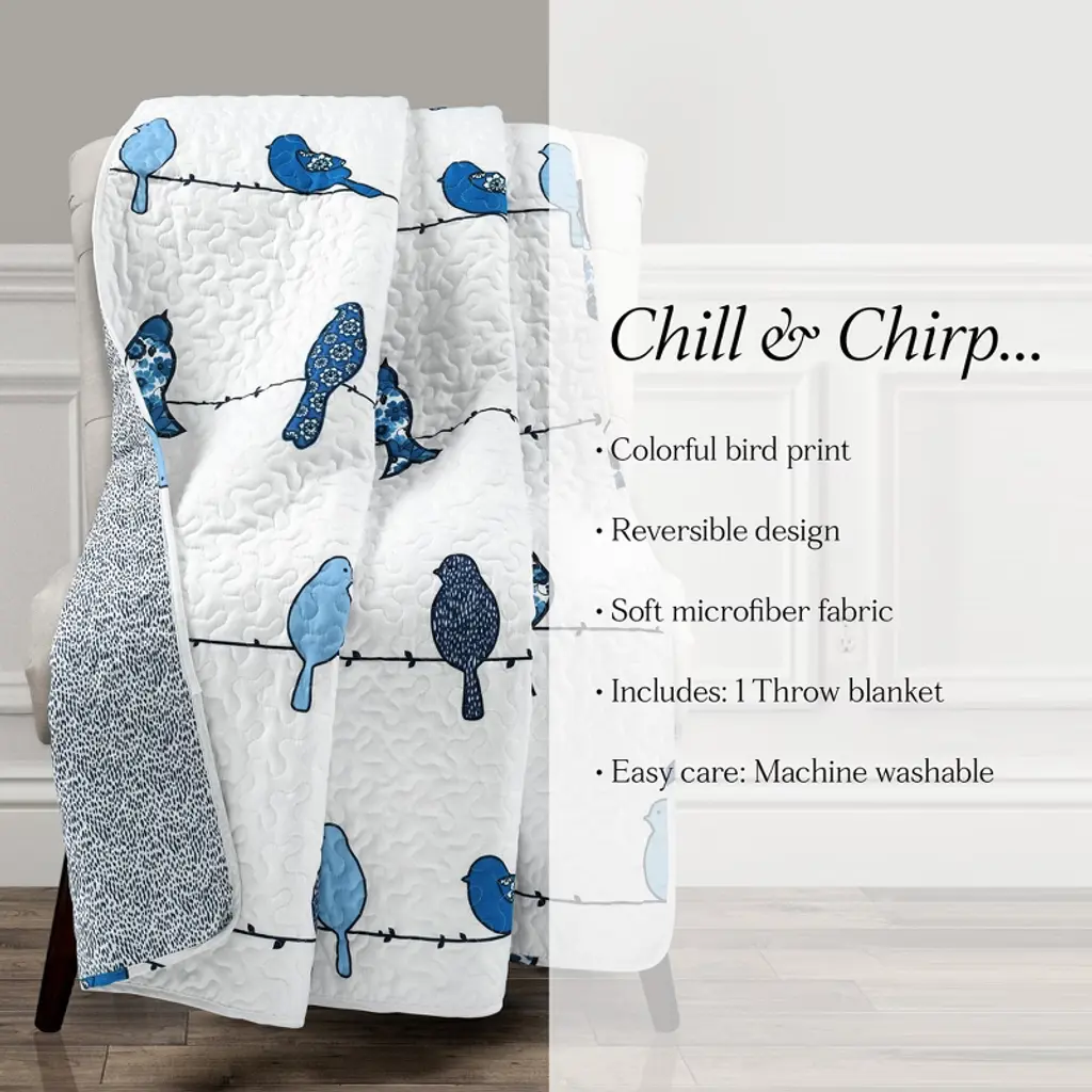 Celebrate your fun side with the Lush Decor Rowley Birds Reversible Quilted Throw Blanket. The front of this eclectic design has rows of colorful birds perched on a wire. Each bird features a whimsical or floral pattern, adding playful charm to your decor. This couch blanket is reversible, giving you two looks in one! Simply flip the throw over to reveal a coordinating dotted pattern. The multicolored design on a white background makes it easy to style with your existing decor. Decorate your boho, coastal, or farmhouse styled home with this cozy throw blankets for bed. It makes is a perfect layering piece for your bed, couch, or chair. This couch blanket is crafted from a soft microfiber fabric with a cotton blend filling, and measures 50 inches wide by 60 inches long. It's the perfect size for single use or for two adults to snuggle in together. This versatile quilted blanket is a must-have for all your cozy moments. Even great as a gift or the perfect pet blanket! To care for this throw blanket for bed, simply machine wash cold on the gentle cycle and tumble dry low. Use a steamer to release wrinkles if needed.