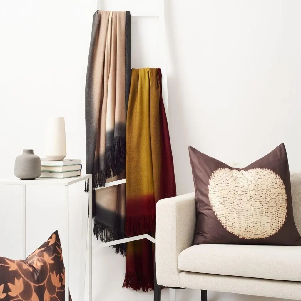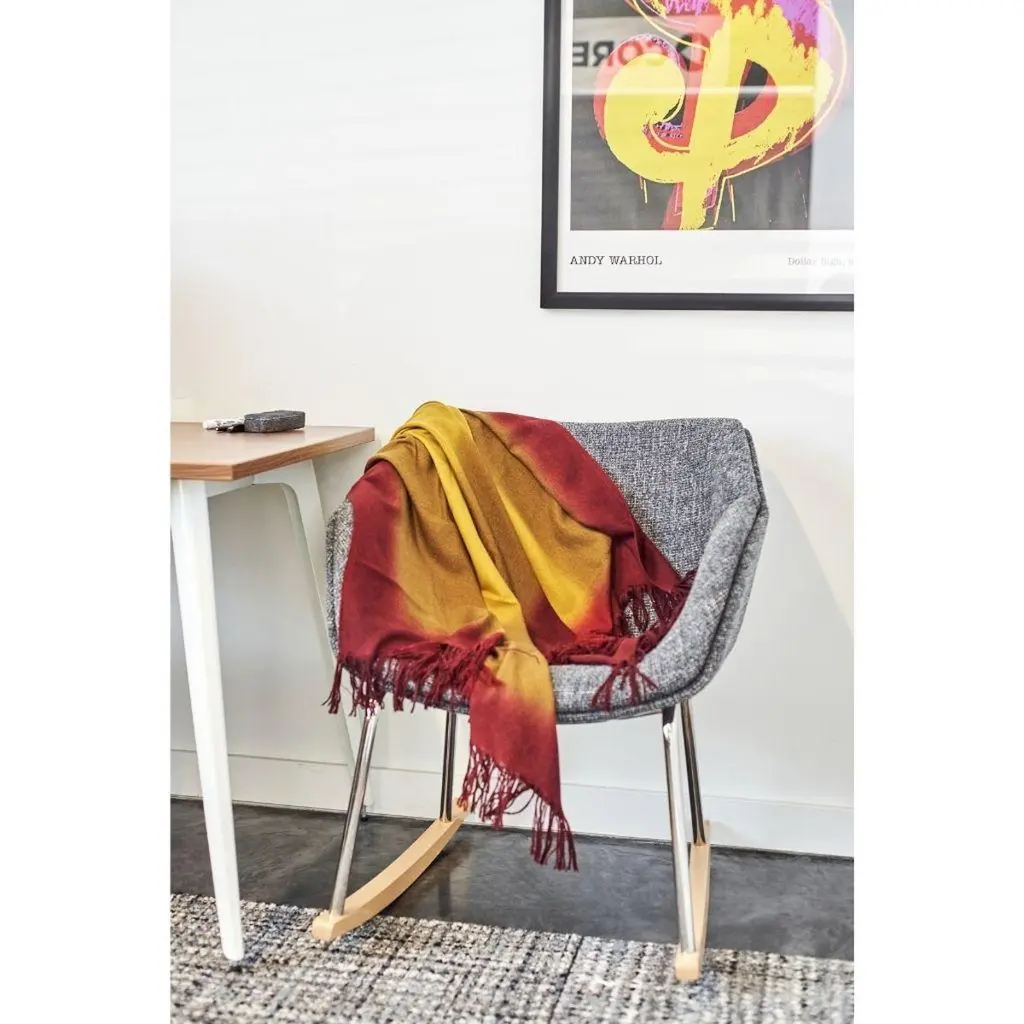 Custom design by Studio Variously, Marigold throw / blanket is handwoven by master weavers in Nepal and dip dyed entirely with eco-friendly certified Swiss dyes. A sustainable design brand based out of Michigan, Studio Variously exclusively collaborates with artisan communities to restore and revive ancient techniques by exploring custom modern designs in textile based products.Each piece is individually dip dyed entirely using earth-friendly dyes. The design is comprised of pleasing pop of ochre musturd and deep burnt red color gradience called ombre effect, that is soothing to the eye and will make any interior space stand out. The beautiful hand rolled long fringes add unique character to the throw. The soft feel of pure merino adds more value to this classic design. This light we throw / blanket is incredibly soft to touch and wears well over time. Requiring attention to detail and finishing, Marigold throw or blanket luxuriously combines heritage value and high quality craftsmanship, perfect as a gift or a personal purchase.For Marigold throw, we are using only the highest quality of soft natural merino yarn, which is later hand-dyed with certified eco-friendly Swiss dyes, free of toxic chemicals, as stated above. Our dyes are specifically engineered to promote the lifespan of each throw. As this luxurious throw is completely handmade from start to finish, each piece is unique. Classic in design, this timeless throw or blanket will enhance interior spaces & also support artisan communities ethically. Our artisans are paid fairly and all our yarns are sourced responsibly. Size: 210 X 110 with fringes Material: 100% Pure Merino From AustraliaColors: Unique ombre effect of ochre yellow, mustard , deep burnt reds.Origin: Ethically handwoven by master weavers in Nepal.Wash care: Separately cold wash with hand & hang dry or delicately dry clean.