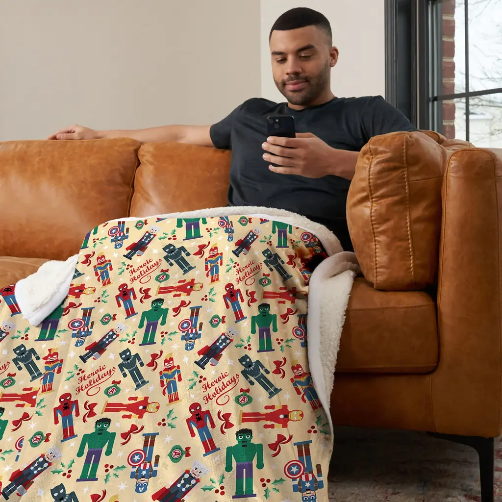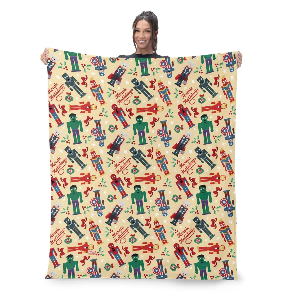 Add some superhero magic to your holiday season with the Marvel Avengers Christmas Silk Touch Sherpa Throw Blanket. This blanket combines iconic Marvel heroes with the joy of the season. Its vibrant design is a great way to showcase your fandom while embracing the festive spirit. Made from silky-soft Silk Touch fabric, this blanket offers luxurious comfort and warmth, perfect for those cold winter nights. Whether you're lounging at home or watching your favorite Marvel movies, it's the ideal companion for cozying up during the holidays. Perfect for Marvel fans, this throw brings together superhero excitement and holiday cheer in a playful and stylish design. Use it to enhance your seasonal decor or gift it to someone special who loves both the Avengers and the magic of the holidaysFeatures: