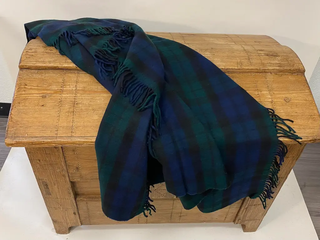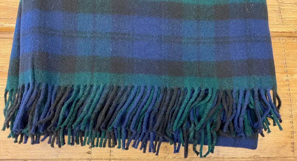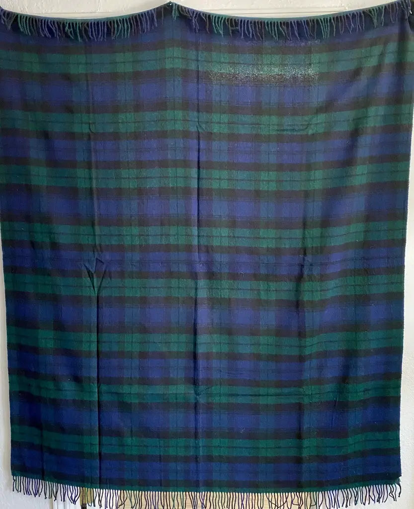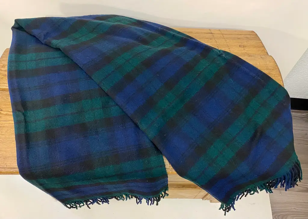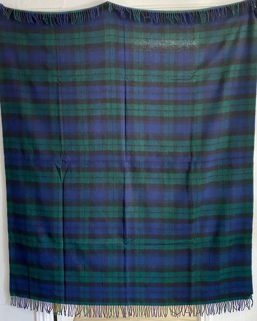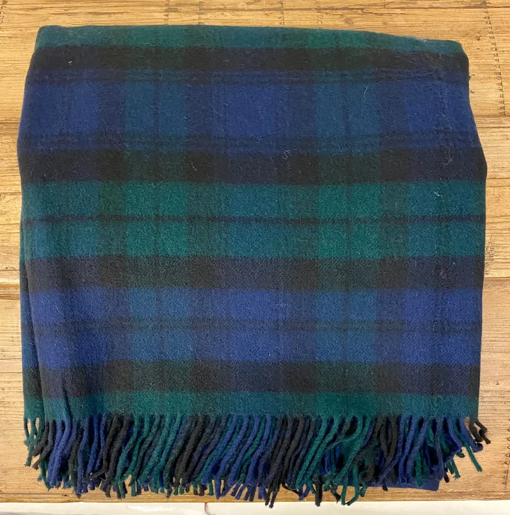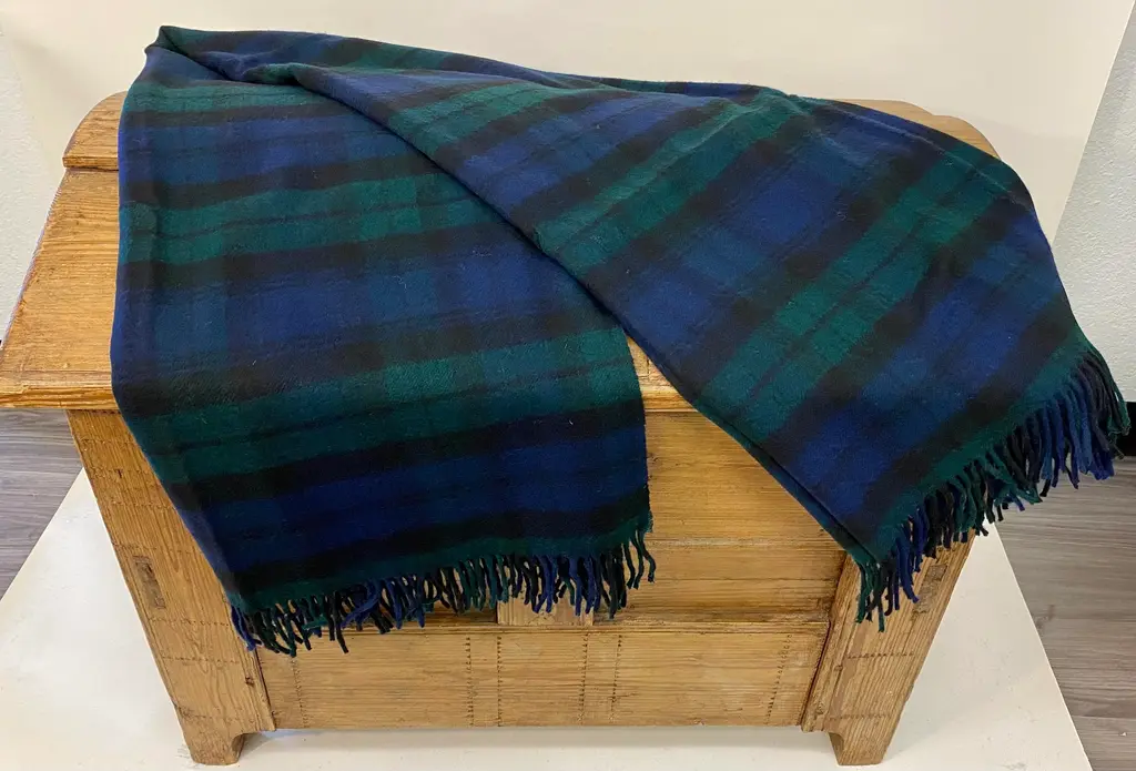 Super Soft Merino Wool Throw In a Black Watch Tartan Plaid Pattern. Made in England A versatile throw in a very familiar Black Watch Tartan Plaid pattern. The colors are blue, green & black. It is made in England. Established in 1837 with over 180 years of proud British manufacturing & design heritage. already to our name, The are one of Great Britain’s last remaining vertical woolen mills. The term ‘vertical’ is a throwback to the Victorian era when mills would rise several stories, with each floor containing separate parts of the manufacturing process. Today it remains a unique confirmation of our authenticity; we control every stage of production from raw wool to finished product including Dyeing, Blending, Carding, Spinning, Warping, Weaving, and Finishing. They create their products with a balance between innovative design & traditional craft, maintaining their position at the forefront of commercial trends with consistent high quality. Perfect for a wedding gift or a birthday gift. Can also be worn like a shawl. Size = Approx 66 inches x 56 inches, not including the fringe. Dry clean.