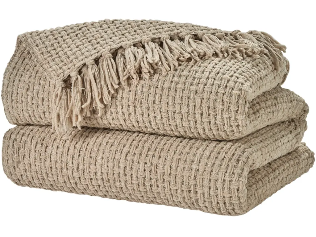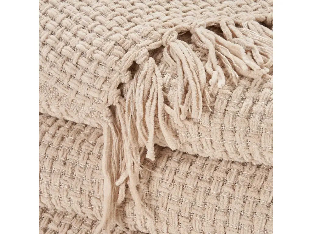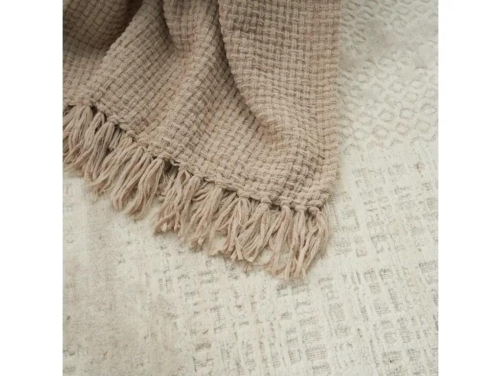 Elevate your space while adding warmth with this beige textured throw blanket from Mina Victory Home Accents. The simple, neutral waffle weave pattern takes on a sophisticated edge thanks to a delightful mix of thick yarns and shimmering threads. This 70” x 103” blanket is finished with a series of long tasseled ends that add an extra dose of texture.