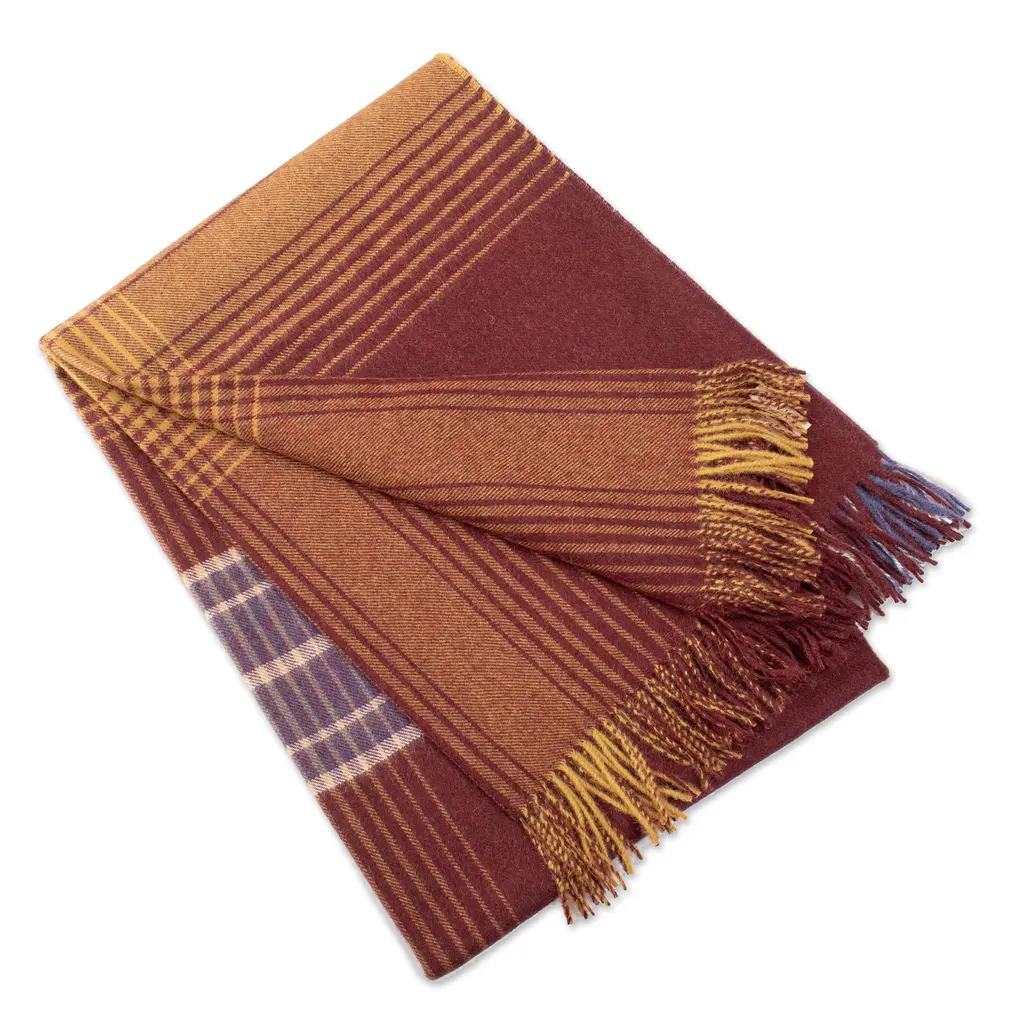 Bold and beautiful, this throw blanket from Peru combines stripes of honey, iris, and snow white over a maroon body. Nataly and Alberto present the design, which is woven from luxuriously soft baby alpaca, the fine fleece from the season's first shearing.