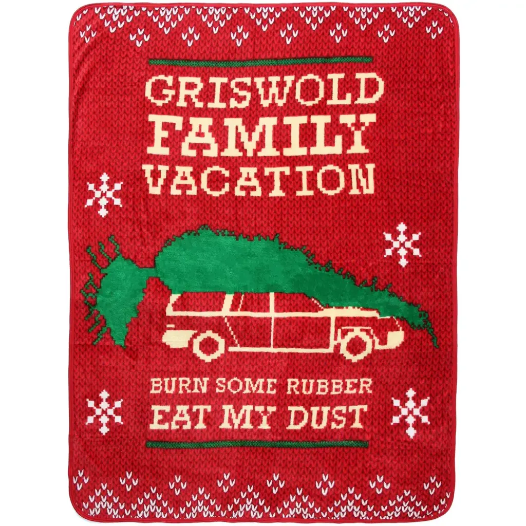 National Lampoon's Christmas Vacation is a classic Holiday film. The story follows Clark Griswold (Chevy Chase) and his family through a wild and crazy Holiday season involving pesky squirrels, moose glass cups, and of course his cousin Eddie. This National Lampoon's Christmas Vacation throw blanket has a great design of the infamous Christmas Tree on the station wagon and the sayings "Burn Some Ruber" and "Eat My Dust." It is made of a super soft fleece 100% polyester red fabric that will have you wanting to snuggle up to your favorite film.